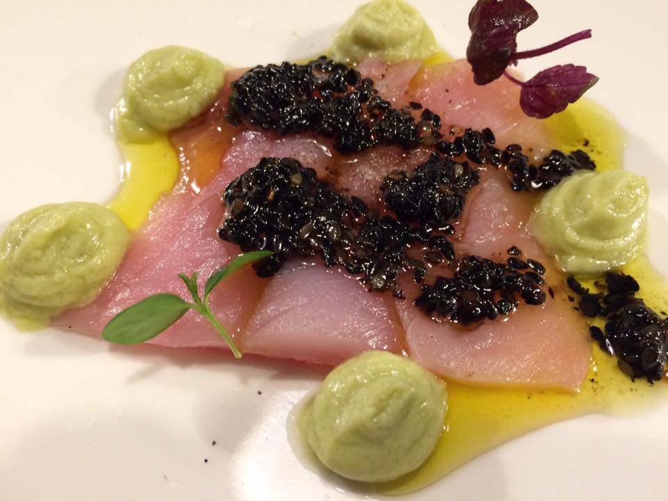 Sancta Sanctorum, Sashimi di ricciola con mousse di avocado e cetriolo e vinagrette al balsamico e soia con sesamo nero