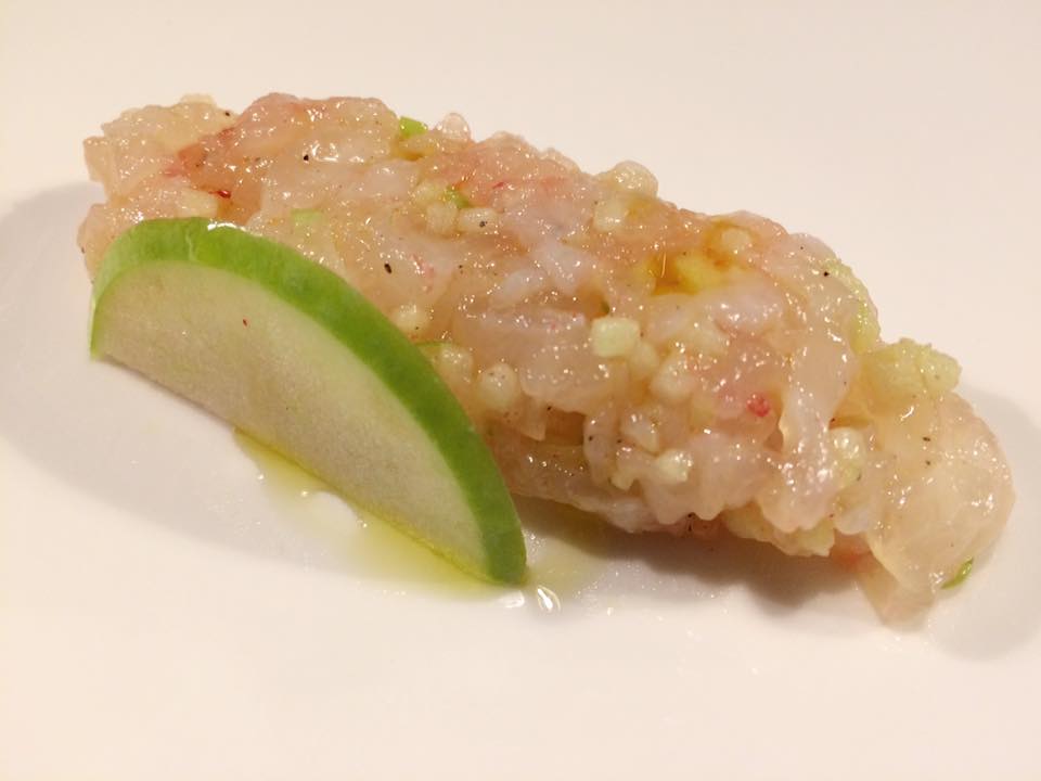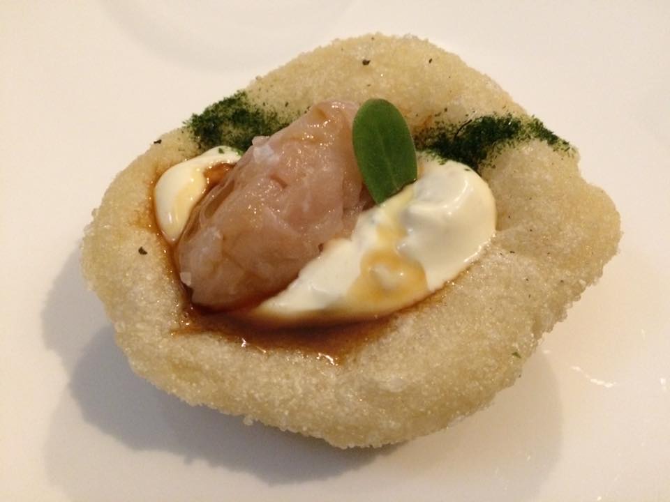Si sale. Si ascende al vero Sancta Sanctorum. Il ristorante. Un benvenuto in stile classico da mangiare con le mani: pizzetta fritta, tartare di pescato secondo disponibilità, ristretto di salsa teriyaki, maionese Escoffier ed alga disidratata. Piatto dettagliato. Più complesso di quanto sembri. Efficace l’interazione fra la salsa teriyaki e la polvere d’alga. Shinkansen diretto Napoli-Tokyo e si è confortevolmente a proprio agio.