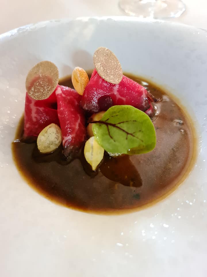 Carpaccio di manzo servito con il suo fondo, foie gras, riduzione di porto, tartufo nero Selezione Calugi