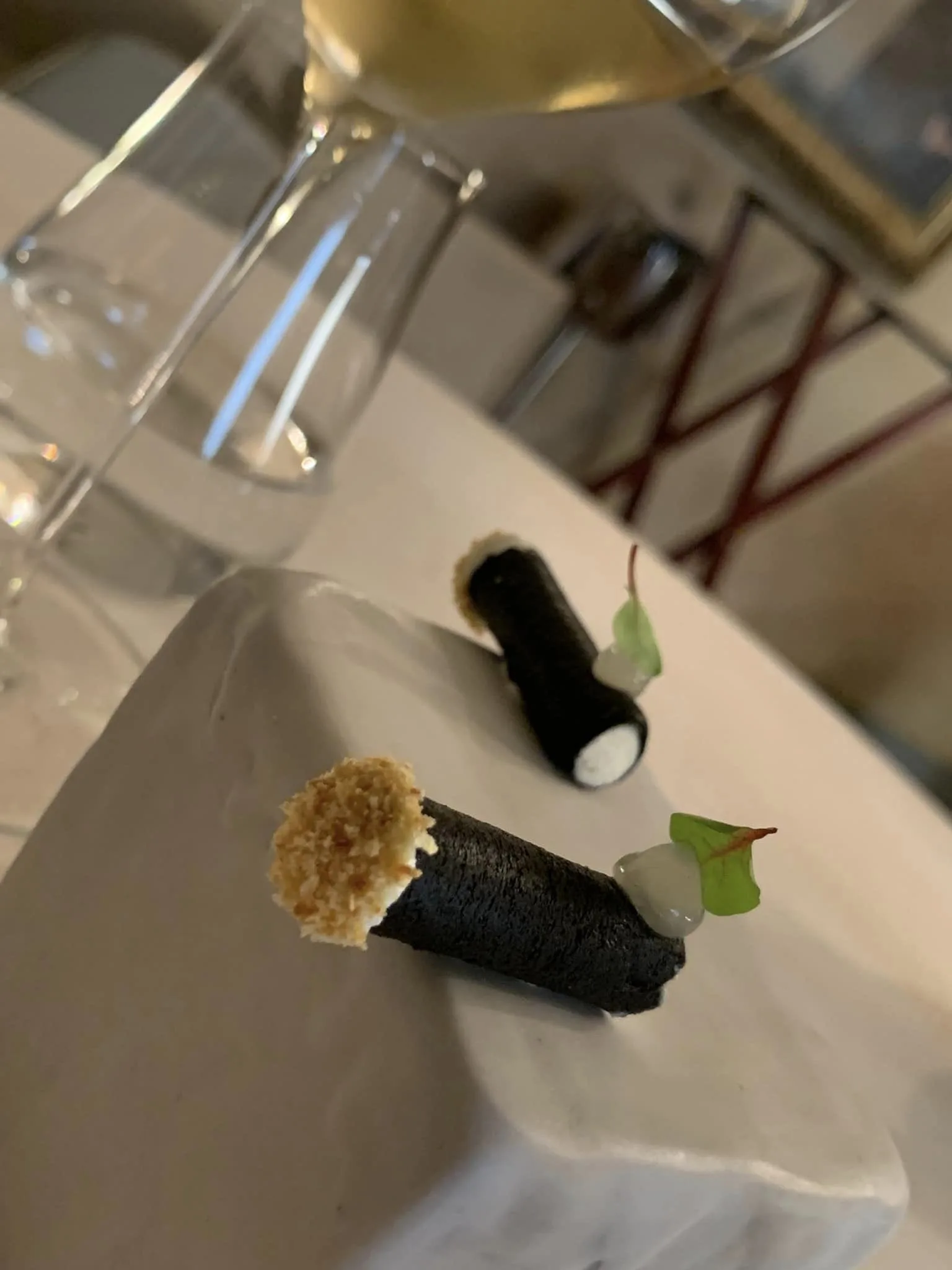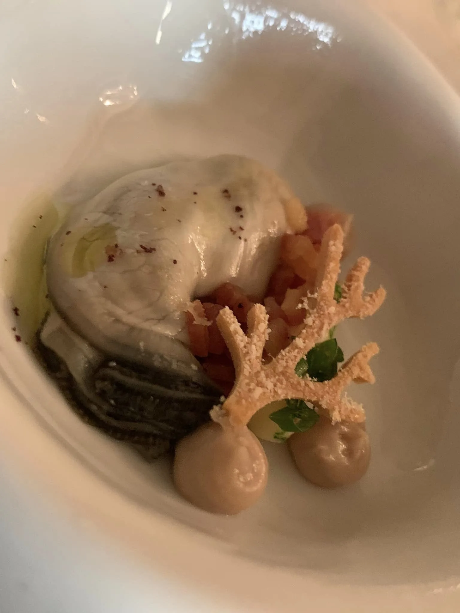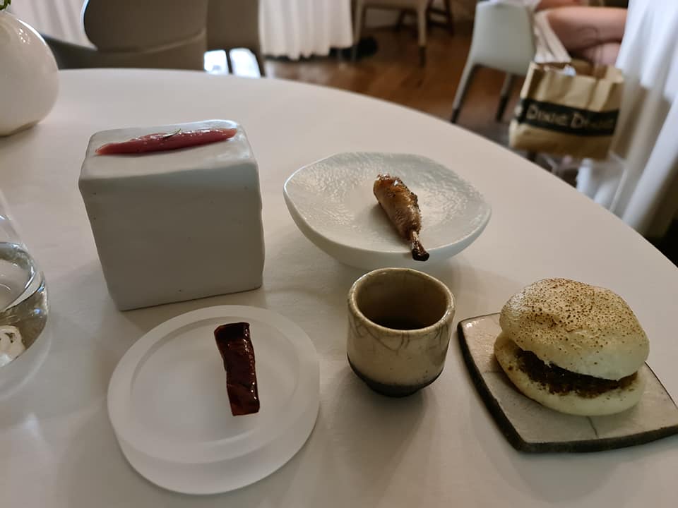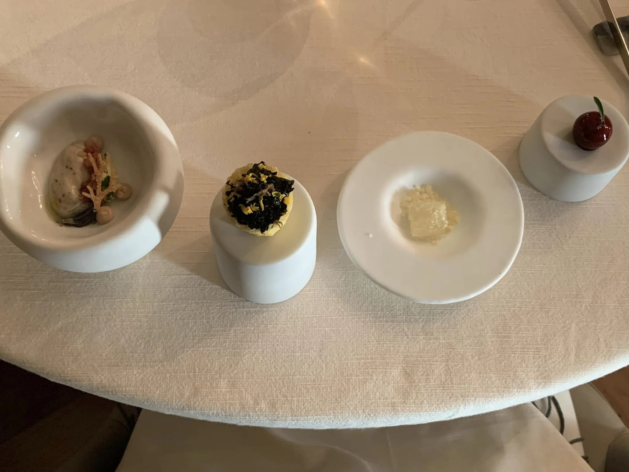 Ostrica, buerre blanc, gel di cetriolo Tartelletta con polpo, teriyaki, caviale di melanzana Carpaccio di anatra, babà rustico, umeboshi Finta ciliegia (fegatini di pollo, capperi, acciuga, ciliegia, barbabietola) Sigaro toscano (oliva nera, formaggio, yuzu)