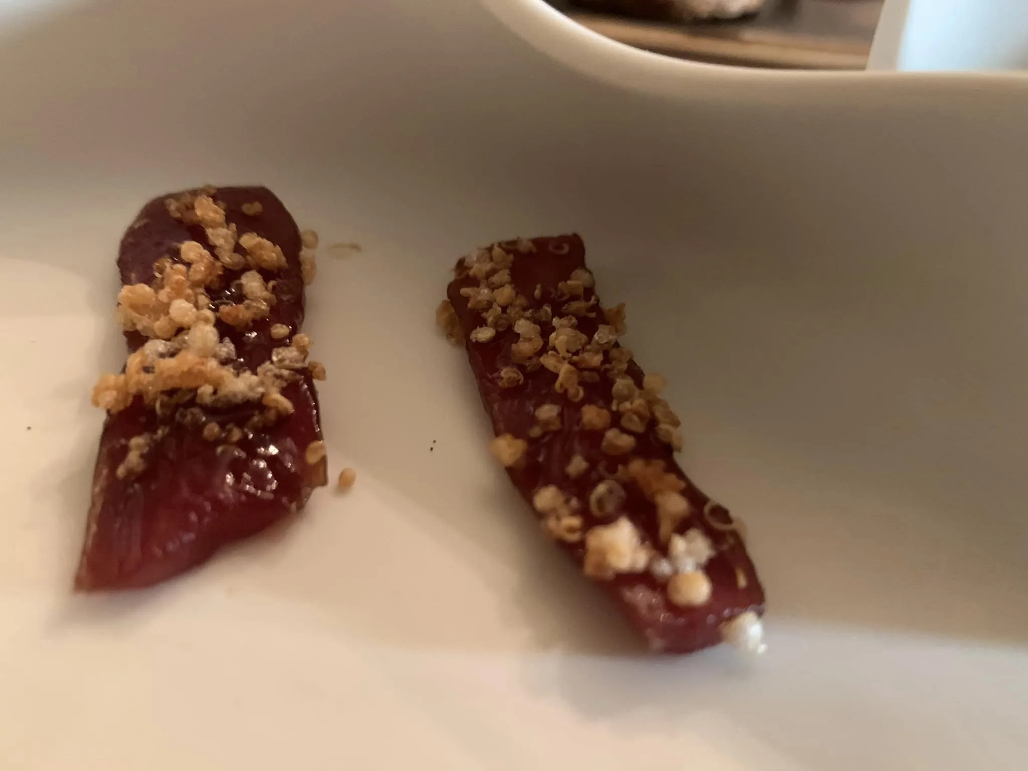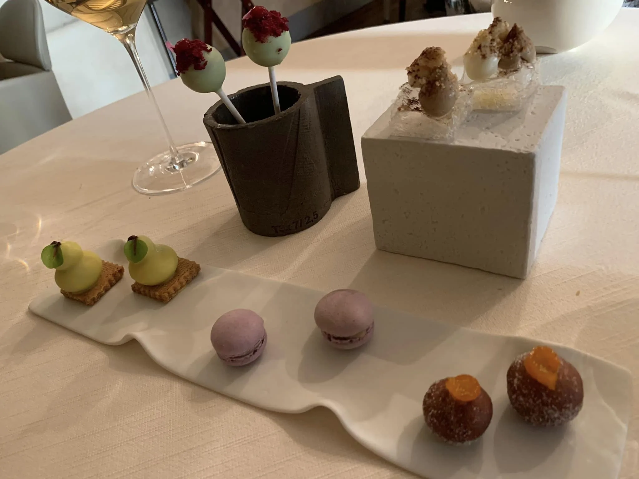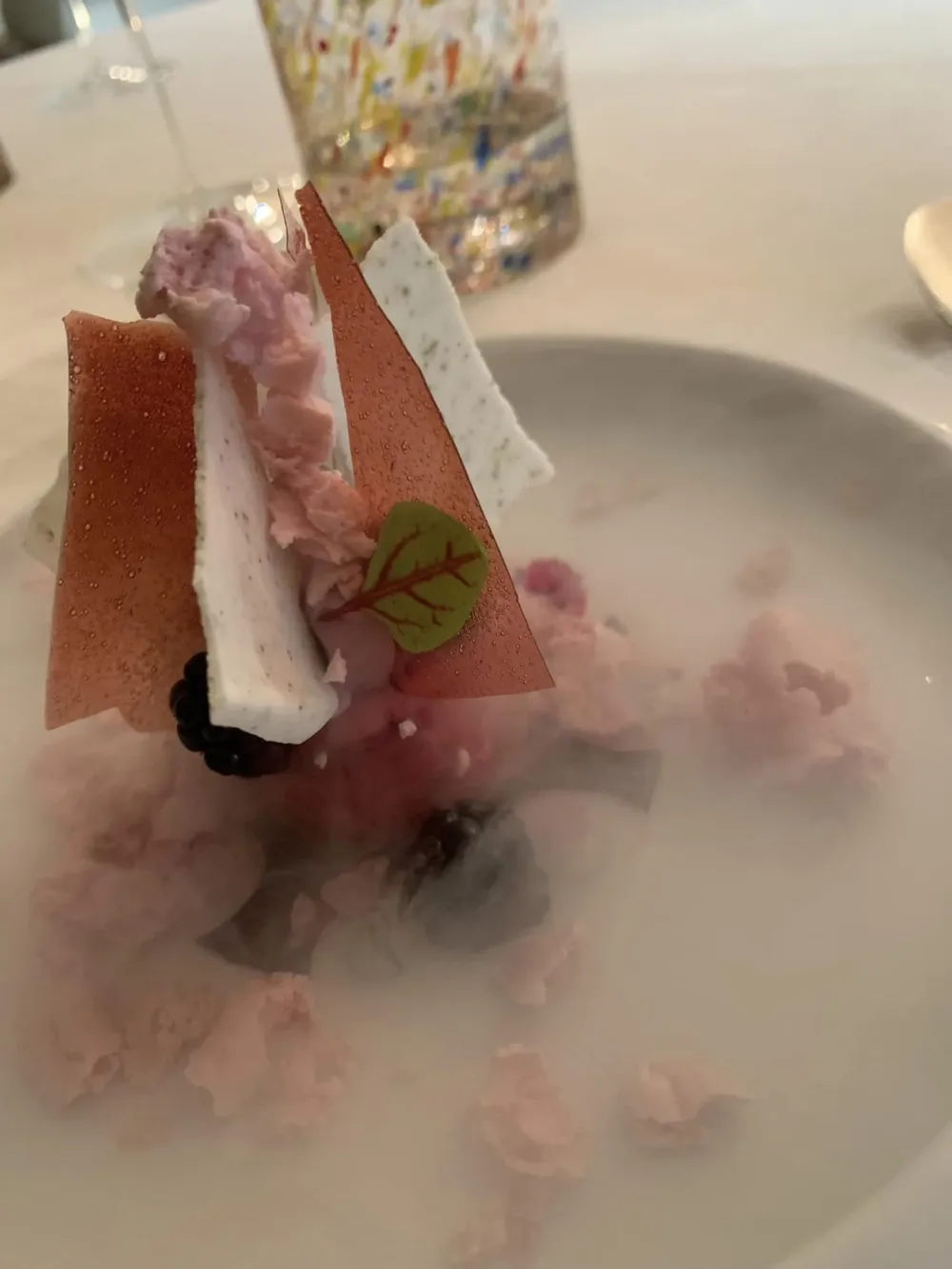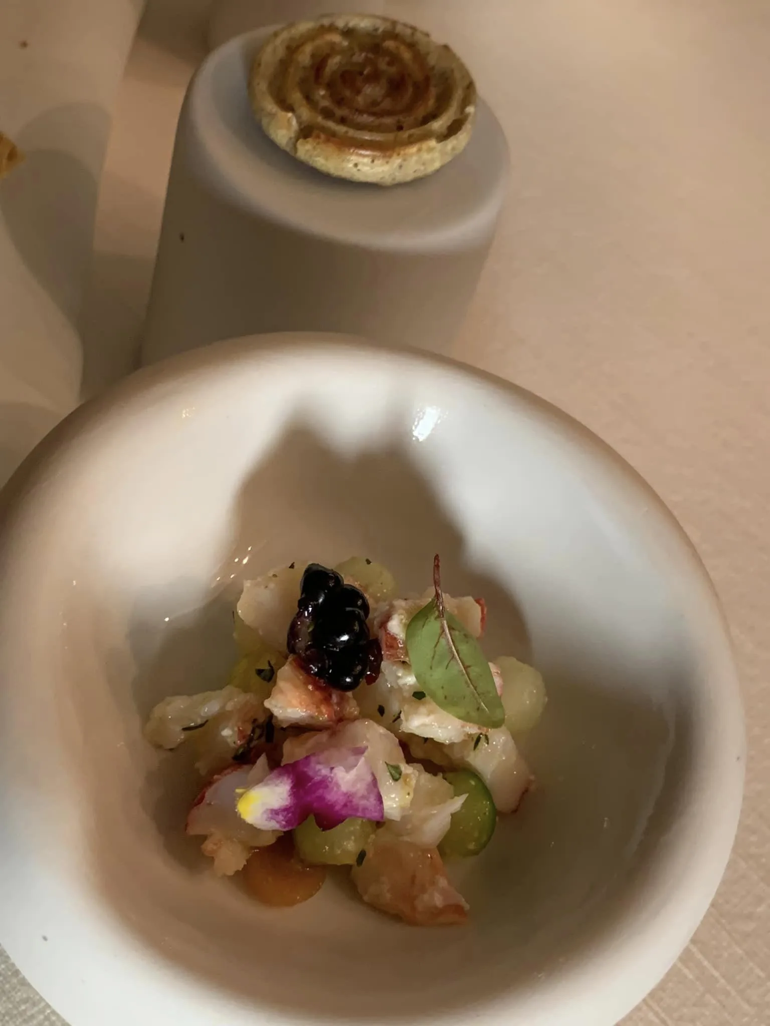 Ostrica, buerre blanc, gel di cetriolo Tartelletta con polpo, teriyaki, caviale di melanzana Carpaccio di anatra, babà rustico, umeboshi Finta ciliegia (fegatini di pollo, capperi, acciuga, ciliegia, barbabietola) Sigaro toscano (oliva nera, formaggio, yuzu)
