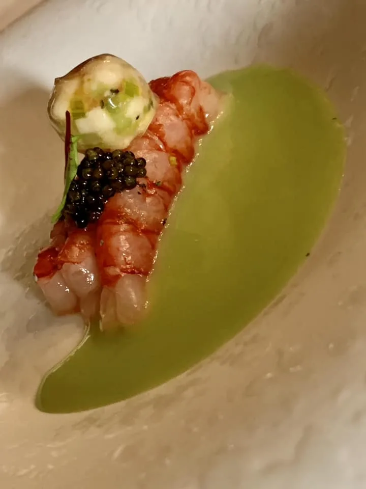 Ristorante Santa Elisabetta, gambero di Mazara, Panzanella all’agro, caviale e zuppetta di Olive di Nocellara