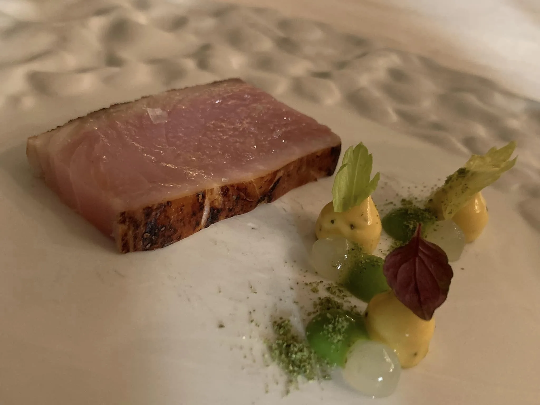 Ristorante Santa Elisabetta, Ricciola affumicata, Bernese, gel di Limoni di Sorrento ed emulsione di Sedano