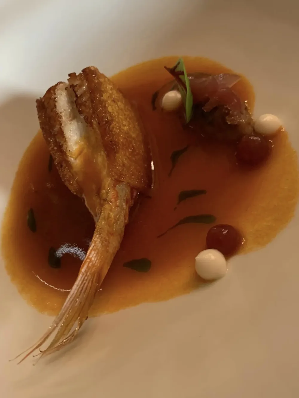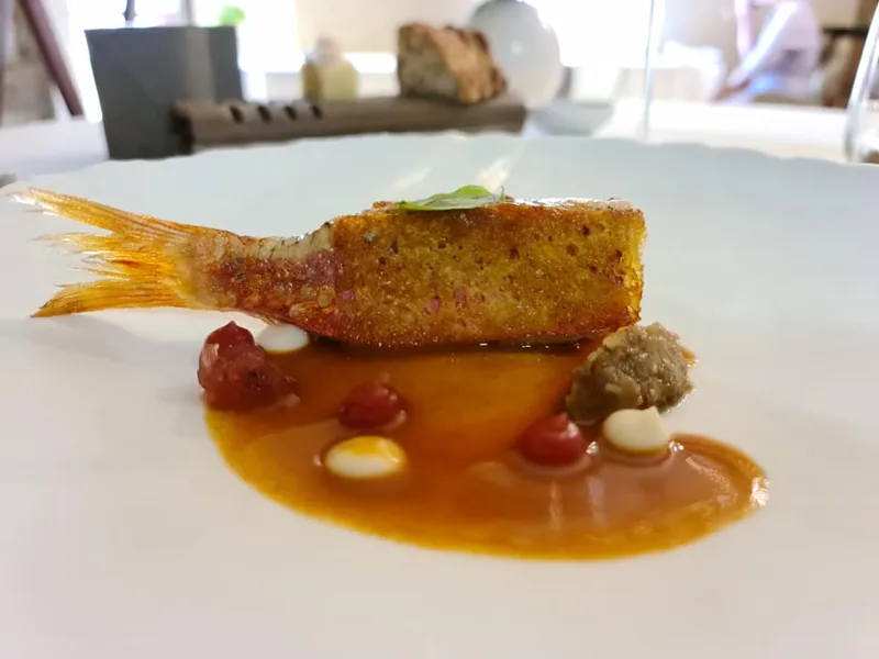 Triglia di scoglio impanata allo zafferano, pesto agrodolce, salsa di aglione toscano e composta di cipolla rossa