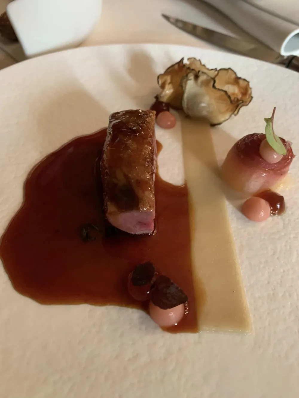 Santa Elisabetta, Petto di Piccione ai carboni, soffice di Topinambur, tatin di Mela annurca e gel di Teriyaki
