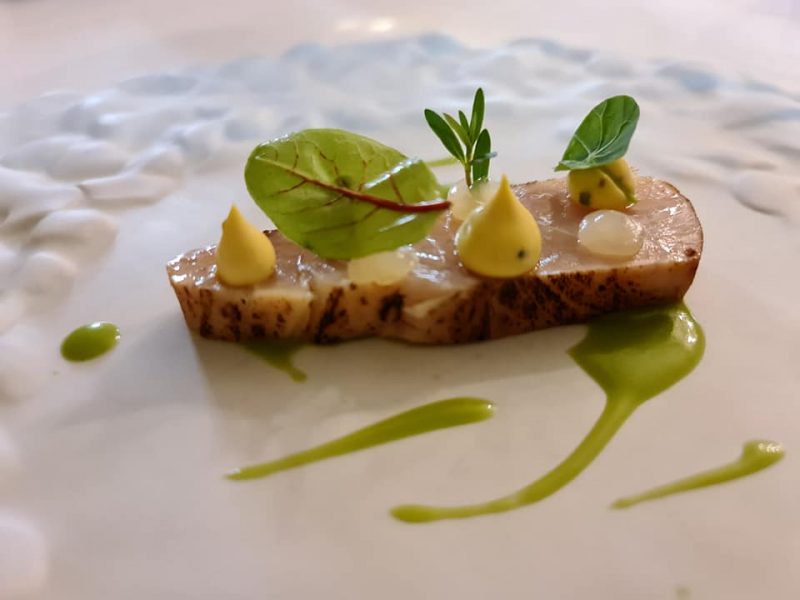 Ricciola affumicata, salsa bernese, gel di limone ed essenza di sedano