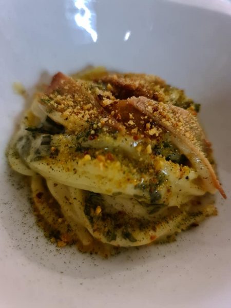 Detto questo pensiamo anche la fugacità del tempo: in effetti l’ultima volta che ho mangiato da lui stava in una piccola osteria a Nocera inferiore in provincia di Salerno. Li mi piacque la sua cucina concreta e rivolta al cliente, ma questa volta ci siamo trovati di fronte ad un professionista maturo, padrone totale della tecnica, assolutamente vocato al pesce come alla carne, maestro di pasta e di ortaggi come tutti i cuochi di origine campana.