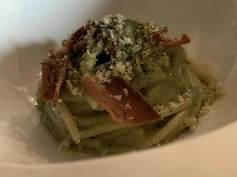 Ristorante Santa Elisabetta, Spaghetti quadrati al burro di Alghe, Ricci di mare, Bottarga e Bergamotto