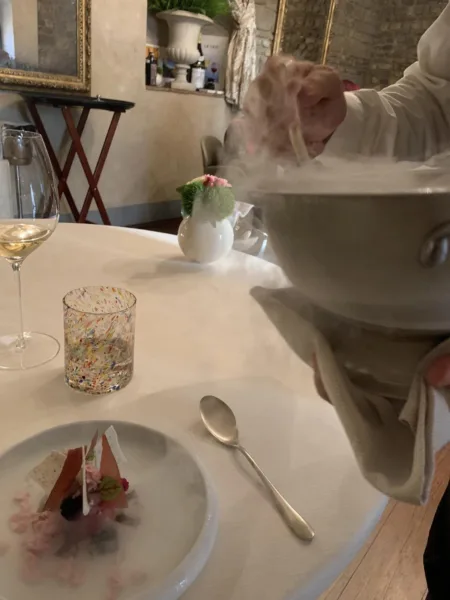 Sei tavoli nella torre della Pagliazza, probabilmente di origini bizantine, all’interno dell’Hotel Brunelleschi di Firenze. Luci soffuse, ambiente pieno di fascino, lunghe tovaglie bianche, pavimento e soffitto in legno, un grande lampadario centrale. Alessandro Fè, gentile e professionale è il restaurant manager. Una carte dei vini con una scelta importante e dei corretti, con la possibilità di scegliere diversi percorsi al calice.
