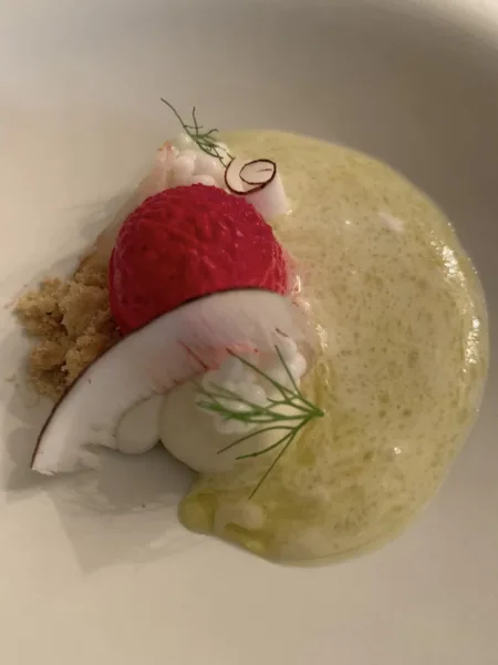 Gambero, ricciola e seppia sono un mix, davvero molto riuscito, delle esperienze di Rocco. La Francia e l’importanza di avere delle salse ben fatte ed equilibrate. La vena mediterranea, negli ingredienti e nell’utilizzo delle acidità naturali, tutto misurato, retto da un equilibro, che quando è così ben fatto diventa meraviglioso. I toni dei piatti non sono mai accentuati, ma non scadono nella banalità.