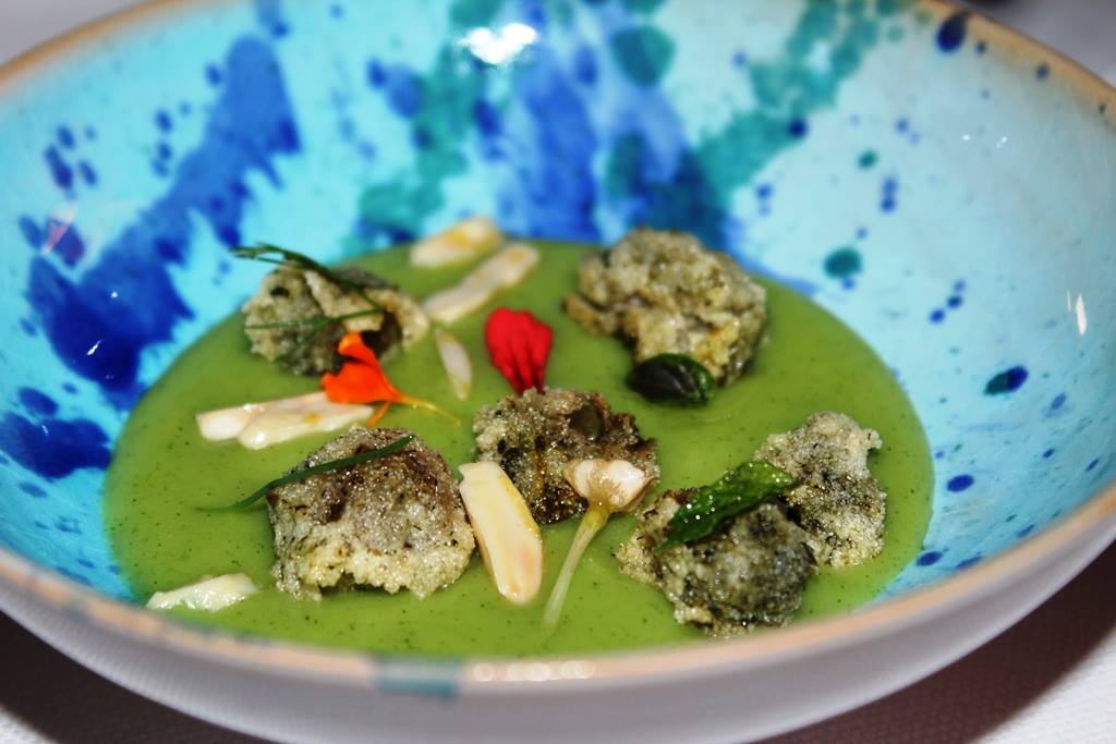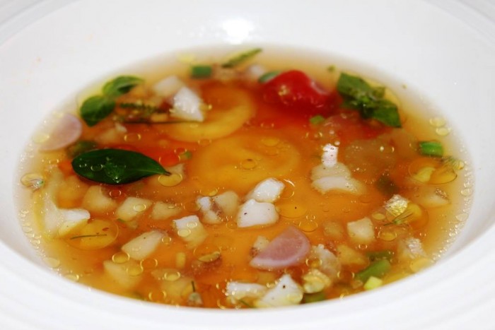 Ancora terra e mare che si fondono e si rincorrono in questo brodo di gallina dai rimandi ancestrali, però elegante nella parte gustativa, solo come un cuoco di grande talento e tecnica riesce a realizzare. Notevole la fattura dei raviolini.