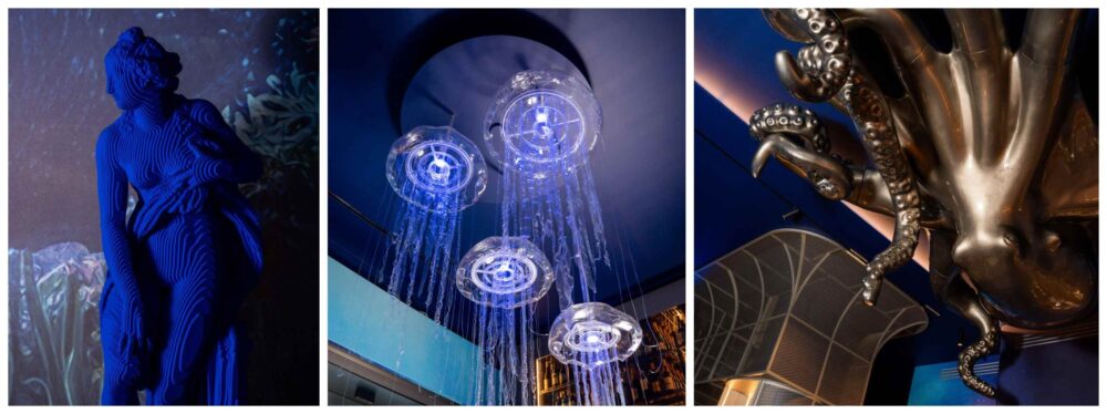 Ampio locale (130 posti tra dentro e fuori), cucina a vista, bancone cocktail bar, vasche con crostacei e vetrine refrigerate con il pescato del giorno, un prive e tante opere d’arte disseminate negli ampi spazi interni.