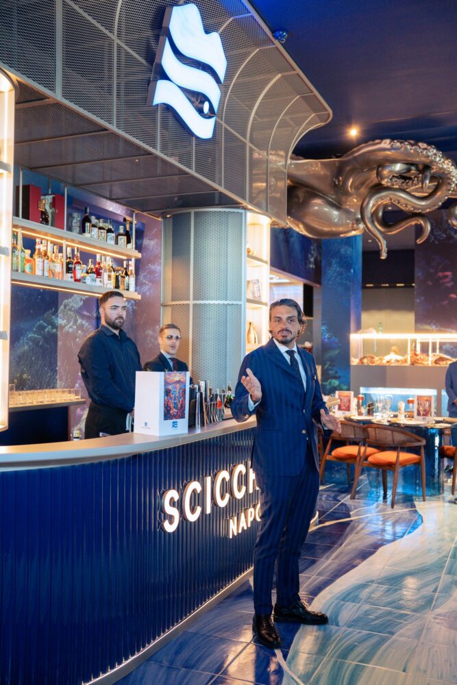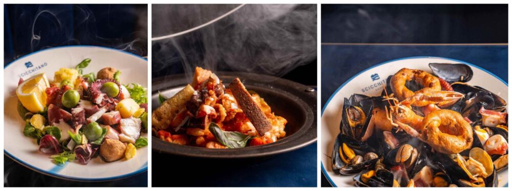 In menu crudi, ostriche, crostacei, pescato, e ancora sauté di vongole, gambero “pop”, zuppa di cozze “La Regina”, pacchero alla Scicchitano che si ispira ai celebri paccheri alla Vittorio dei fratelli Cerea, con astice, scampi e gambero. In carta c’è poi il risotto a 4 mani con lo chef stellato Roberto Di Pinto, tra i secondi l’Astice Gold (astice blu su provola e foglia d’oro), oltre al baccalà in olio cottura o in tempura. Non manca lo spaghetto alle vongole, simbolo dell’anima partenopea del ristorante. “Ho deciso di aprire sul lungomare perché per me è una nuova sfida, che mi dà stimoli e voglia di crescere sempre assieme alla mia grande squadra che è ormai famiglia”, dice Scicchitano. In sala il maitre Alessandro Sansò, sommelier Pietro Marotto e una folta brigata di chef coordinati da Giuseppe Scicchitano.