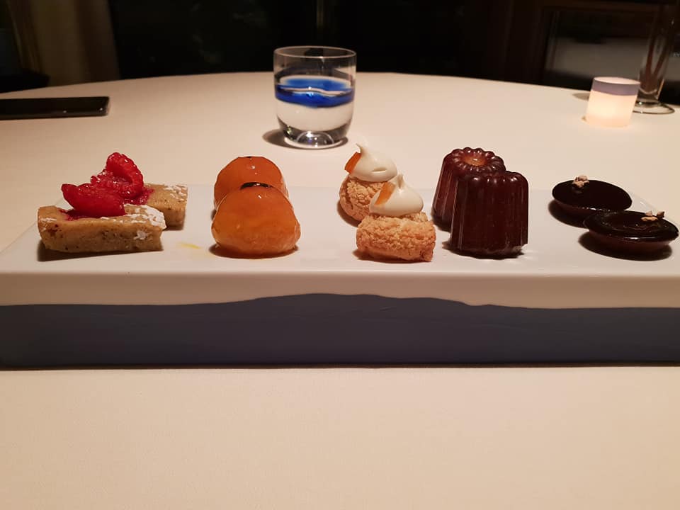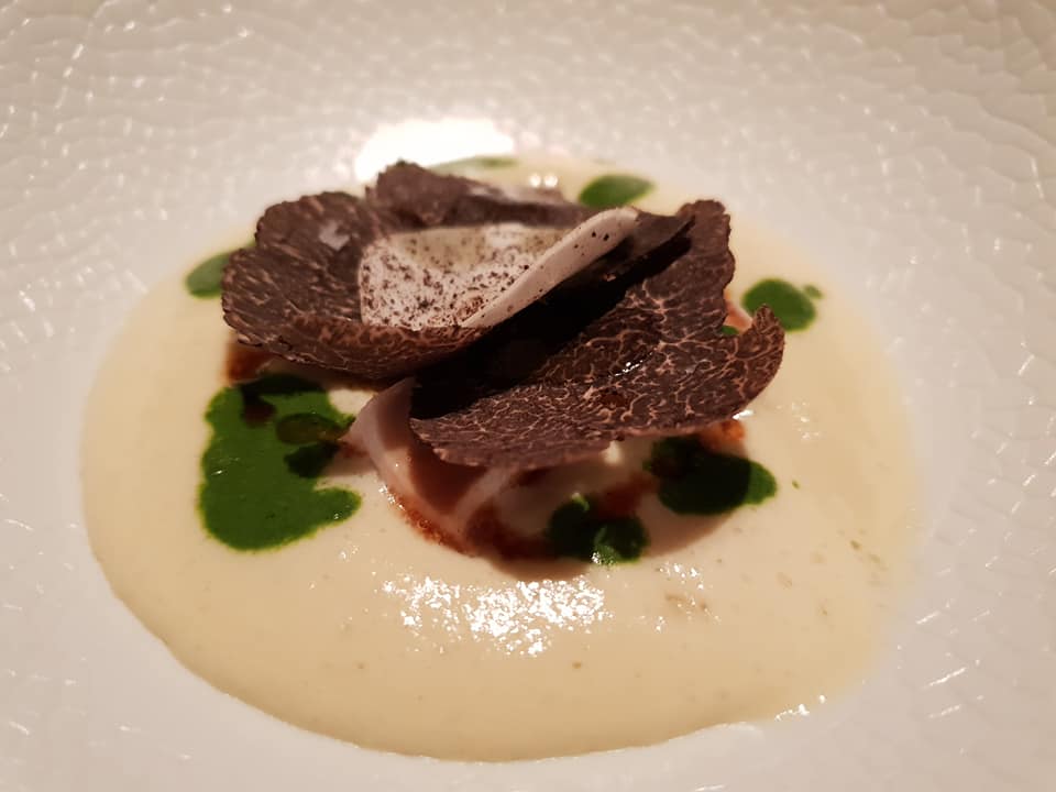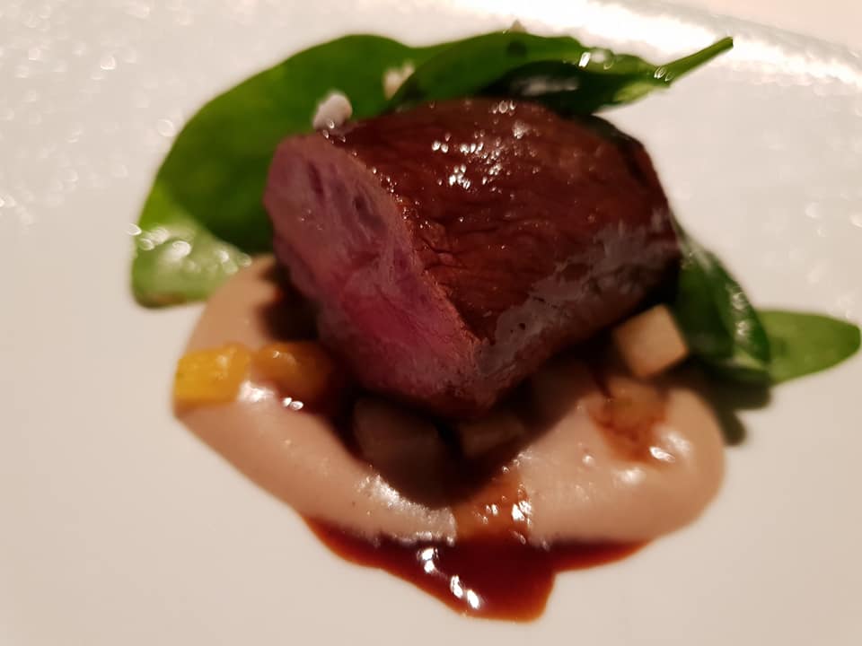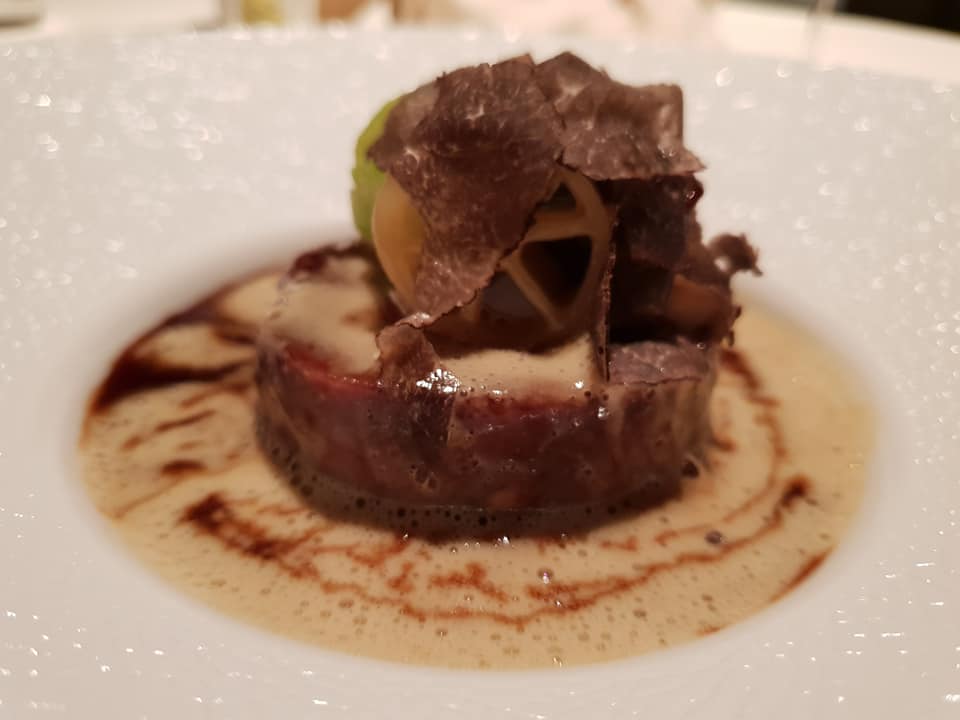 Nell’intermezzo, al posto del risotto, un risone variopinto con ostriga, fegato grasso, tartufo nero e il fondo della cacciagione: non osiamo immaginare cosa sarebbe stato con il riso, ma senza dubbio l’utilizzo del risone lo rende più leggero e più simile a un intermezzo che a un vero e proprio primo piatto.