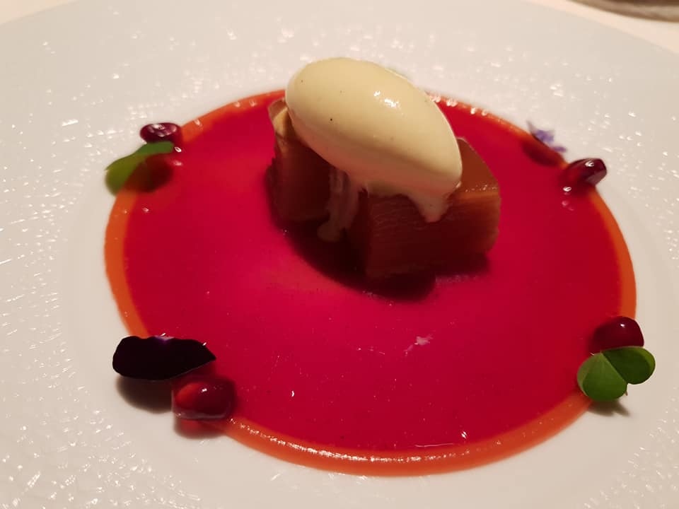 - mela fondente con salsa alla melagrana, gelato al pan brioche e cognac