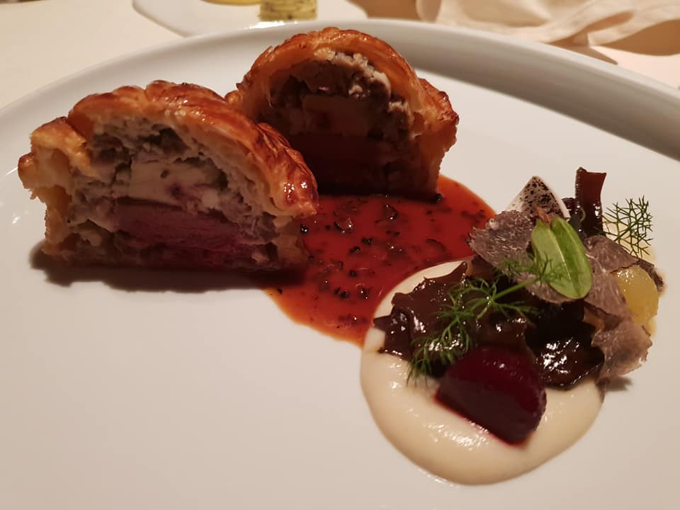 - tortino di colombaccio, fagiano e fegato grasso con verdure invernali e salsa Perigord