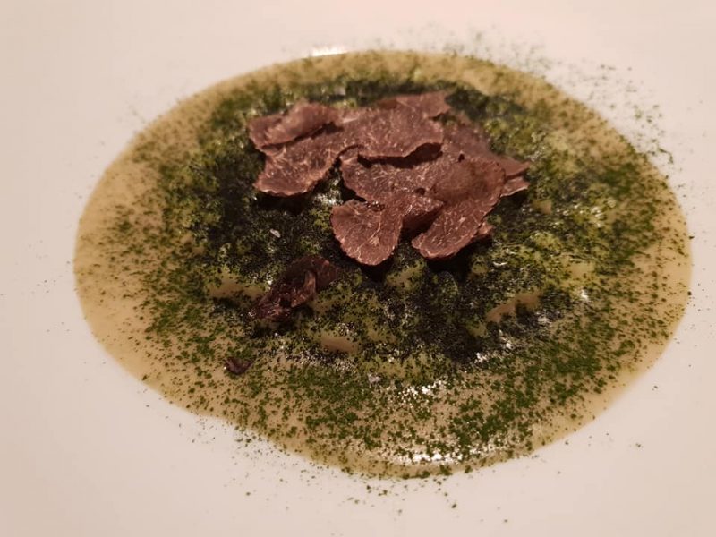 Risotto con anice stellato con scorzonera e polvere di cavolo nero, resta andante con moto. Perfetto nell’esecuzione, gioca sui cambi di ritmo del vegetale.