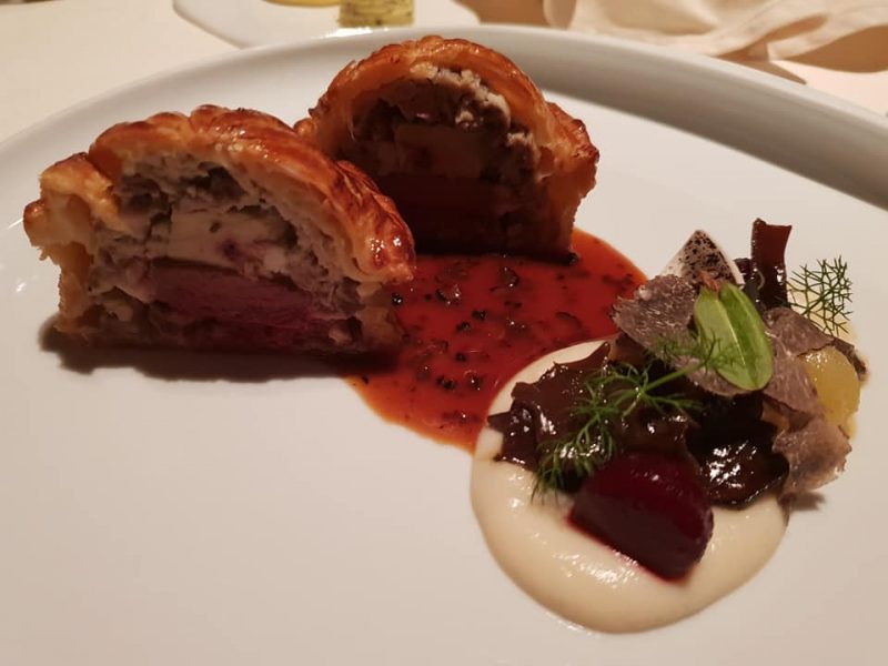 A seguire, il dittico dei grandi piatti di caccia cui nessun grande chef potrebbe rinunciare. Il tortino di capriolo e fagiano con sedano rapa e verdure invernali è di fatto una “pithivier” di sfoglia ripiena delle carnia strati accompagnata dal fondo della cacciagione. Dulcis in fundo, sua maestà la lepre alla royaleaccompagnata dalla “ruota pazza” di Benedetto Cavalieri, da tempo signature dish di Guida e piatto semplicemente magnifico.