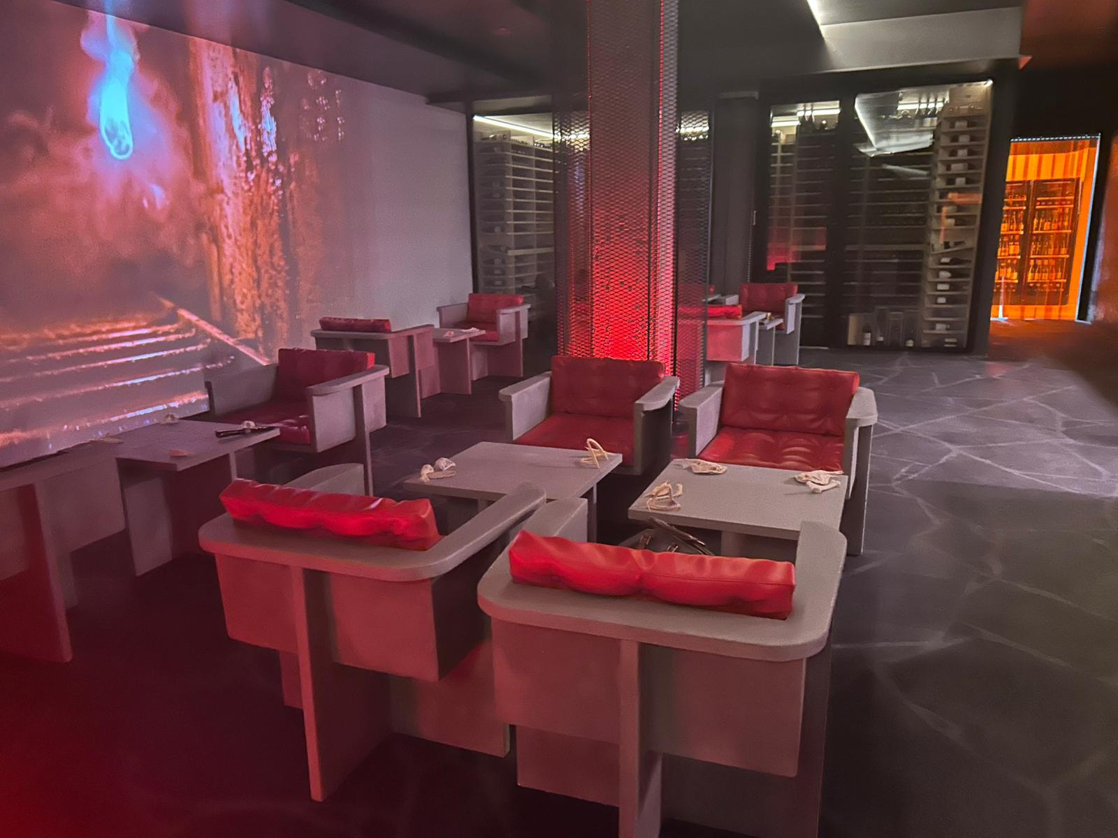 Marmo e pietra sono protagonisti degli arredi. I pavimenti in pietra lavica ‘ad opera incerta’, una tecnica che risale al periodo romano, e le colonne di cemento ingabbiate in acciaio riportano all’esperienza onirica di Pasquale Trotta. Il colore predominante è il rosso che emerge non solo dalle istallazioni multimediali, ma anche da molti elementi dell’arredo.