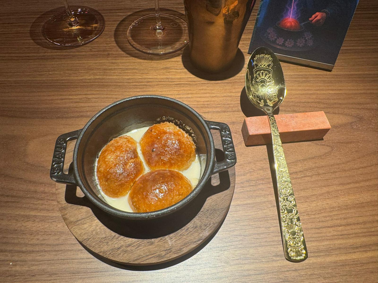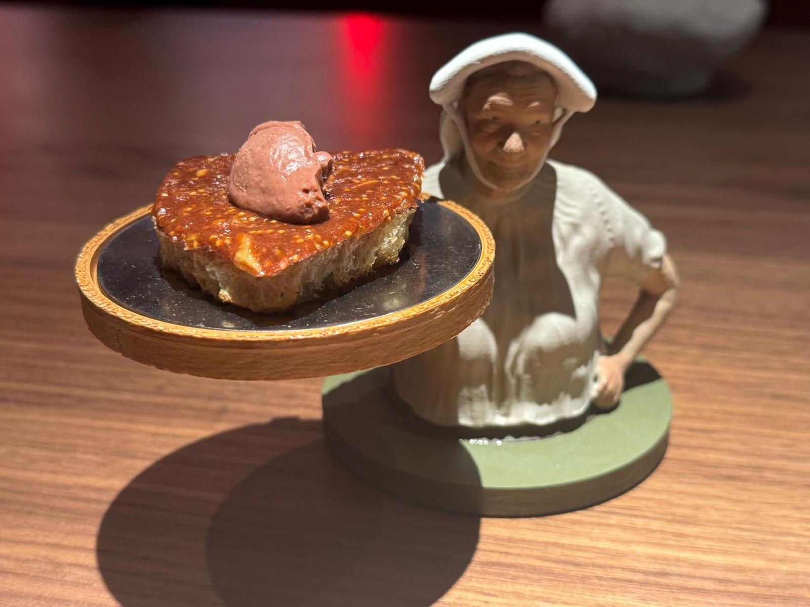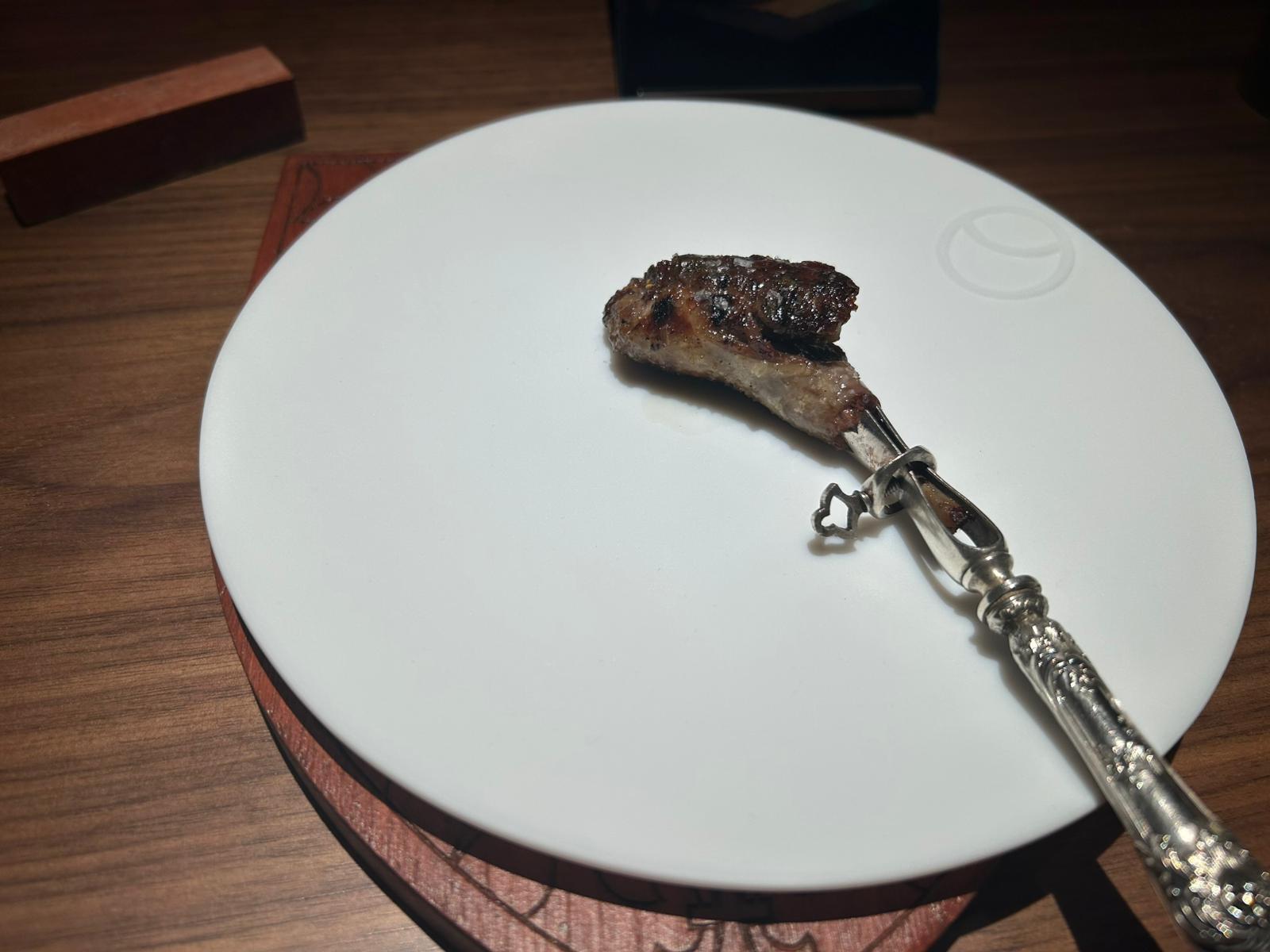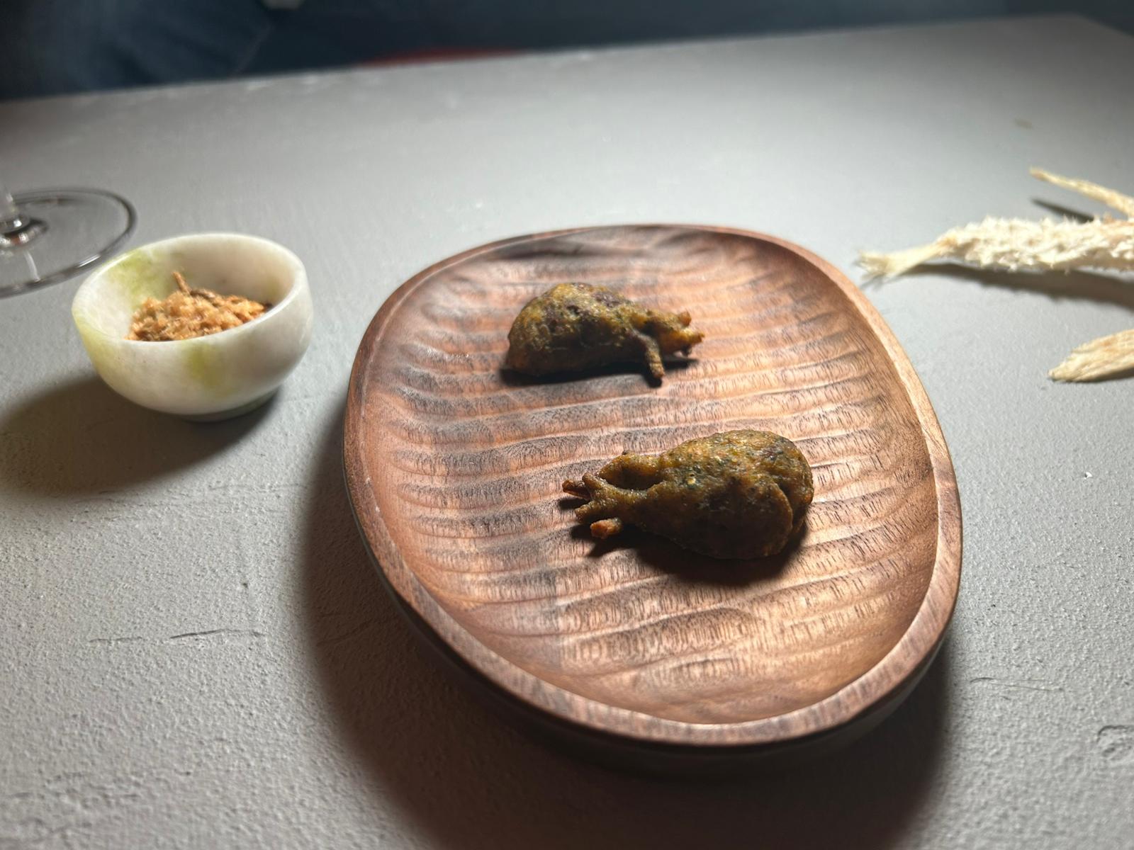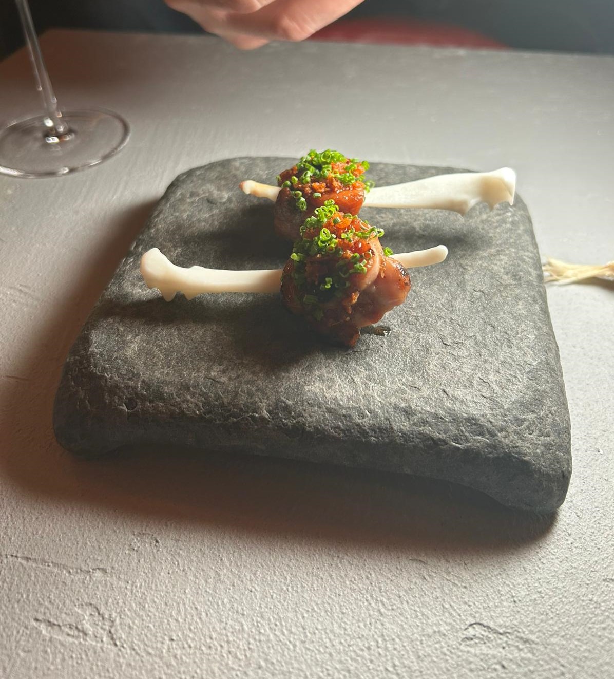 A seguire l’animella in salsa barbecue e mela e il cuore di pollo, perfettamente riprodotto nella forma dallo chef, con curry thailandese. Sostanzialmente il sunto dell’alimentazione quando non esisteva ancora la cucina e la sopravvivenza era affidata a ciò che l’uomo riusciva a strappare ai predatori, ossia le interiora.