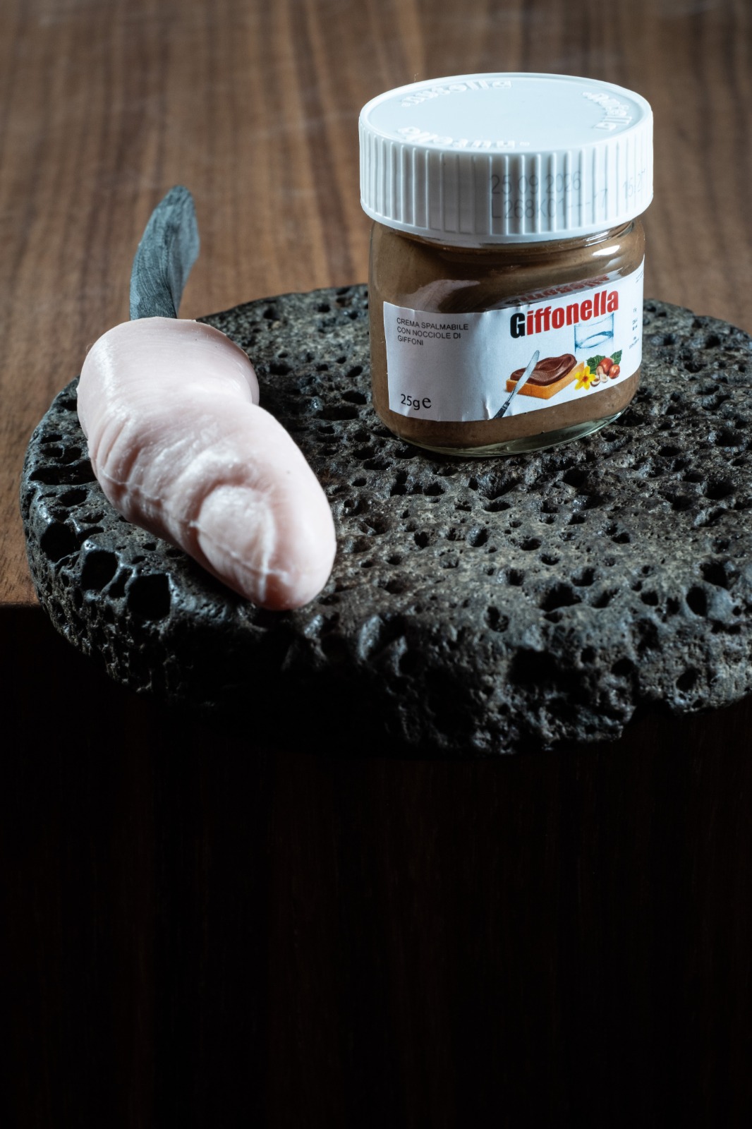La denuncia al cibo spazzatura causa di obesità, dipendenza e fragilità è rappresentata dalla Giffonella, crema spalmabile fatta solo con cioccolato, latte e nocciole di Giffoni, da consumare rigorosamente con il dito in gomma che sostituisce il cucchiaino.