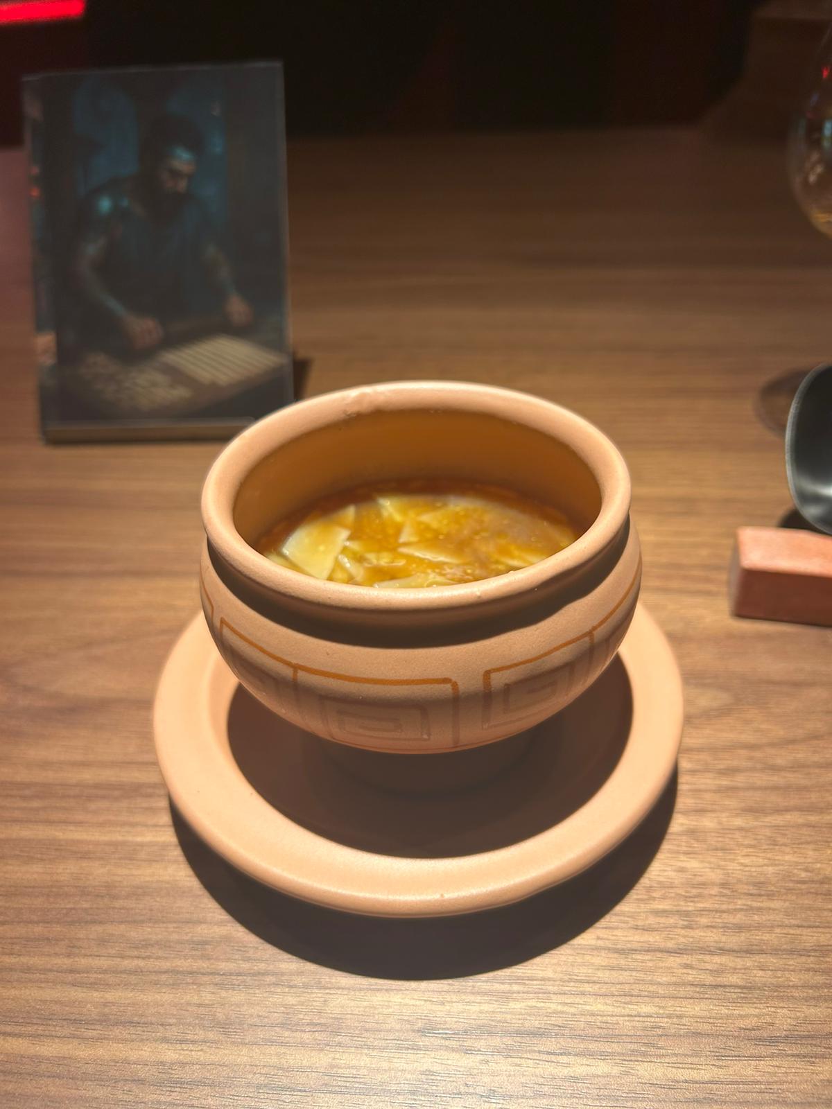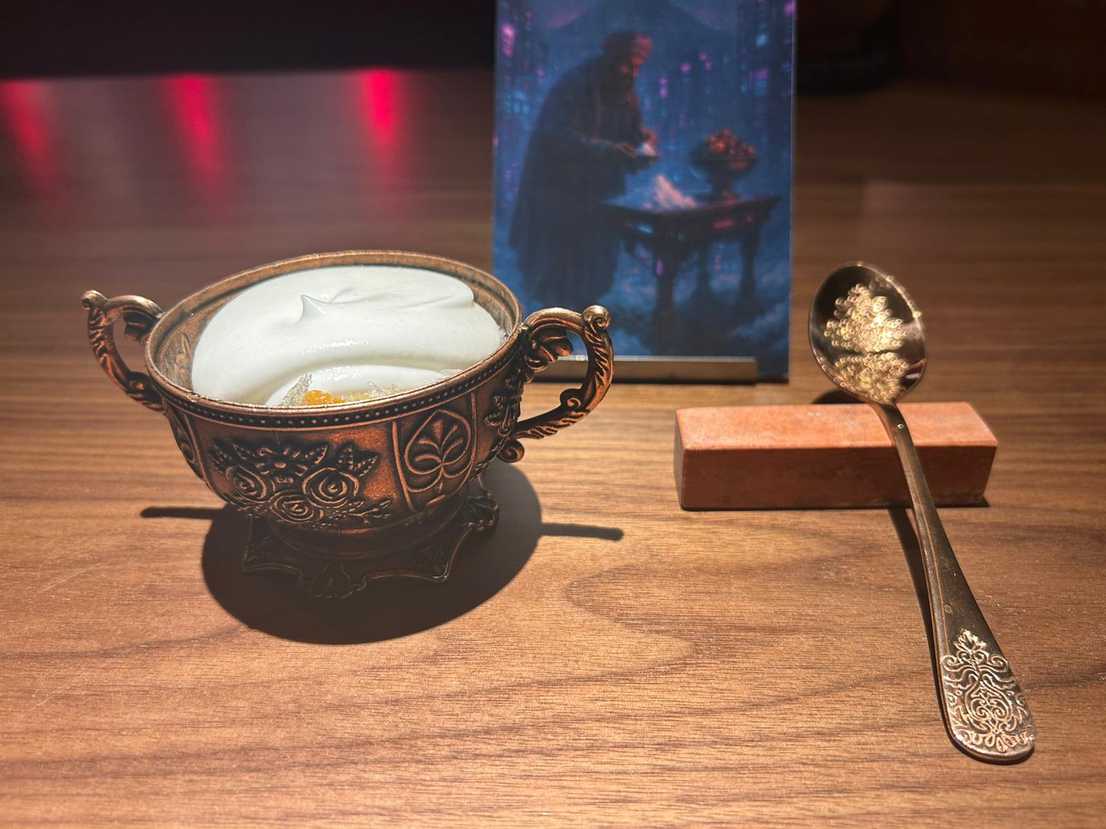 Ci sposta nella Popina, la zona pranzo, dove la prima portata una evanescente spuma di kiwi è ispirata a Parmenide, mentre la laganon – antenata della pasta – con brodo ottenuto dall’estrazione di ceci di Cicerale parla della Magna Grecia.
