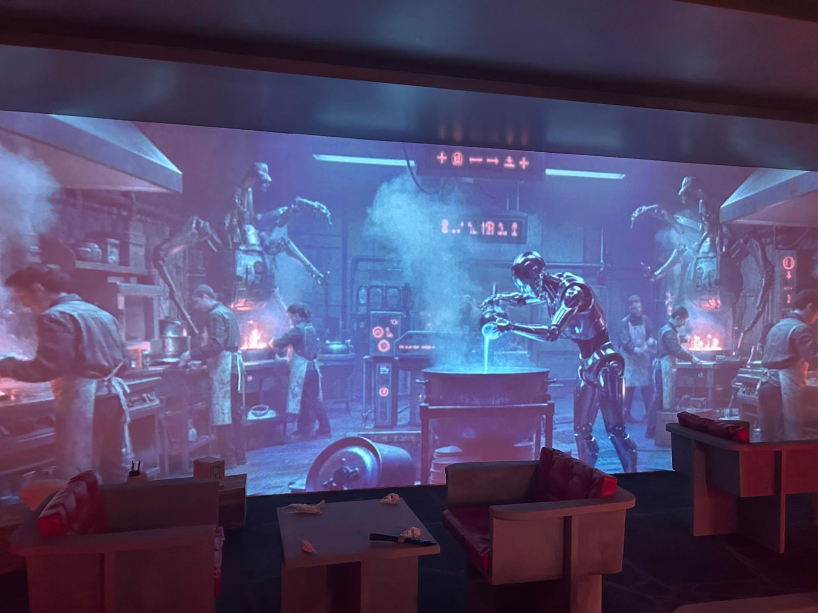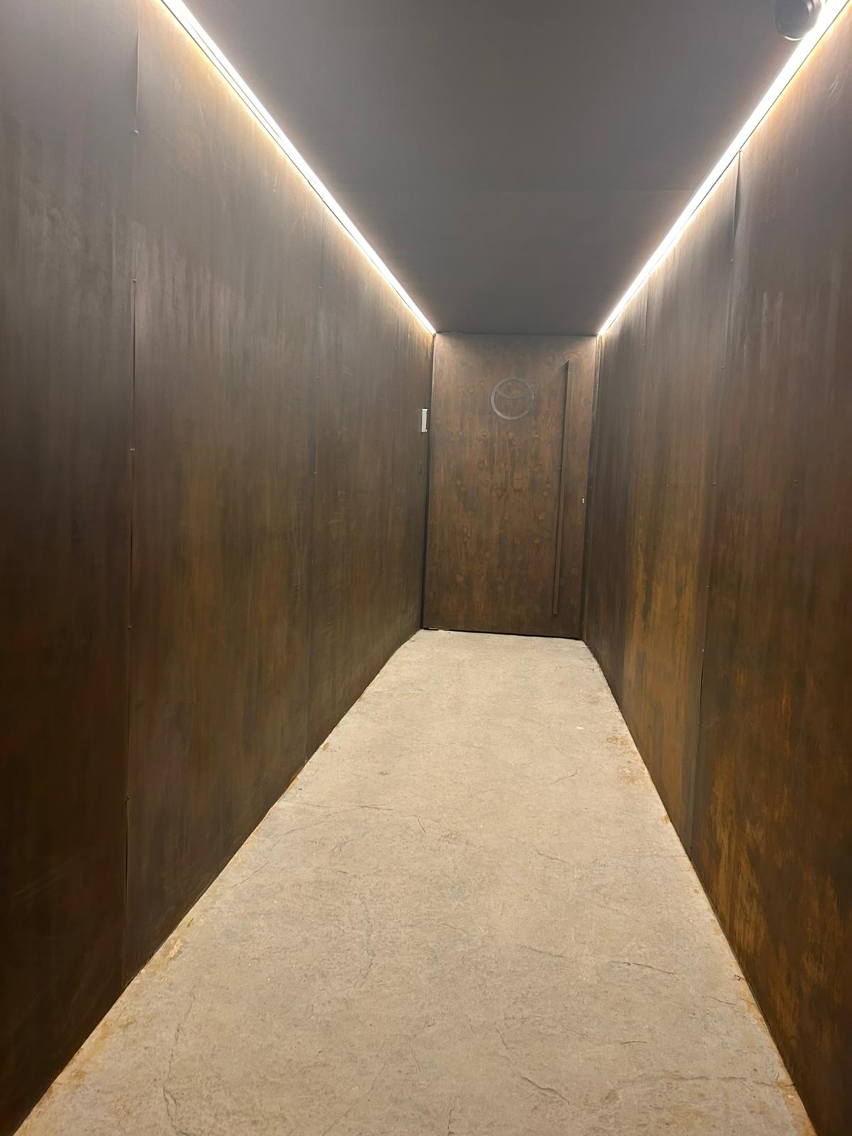 L’ingresso e costituito da un tunnel interattivo con istallazioni multimediali, luci e audio che trasportano immediatamente in un tempo che oscilla tra passato e futuro. Ad accogliere gli ospiti si alternano due giovani ebolitani attori teatrali Ludovica La Monica e Emilio Grippa che introducono e raccontano il concept del ristorante.