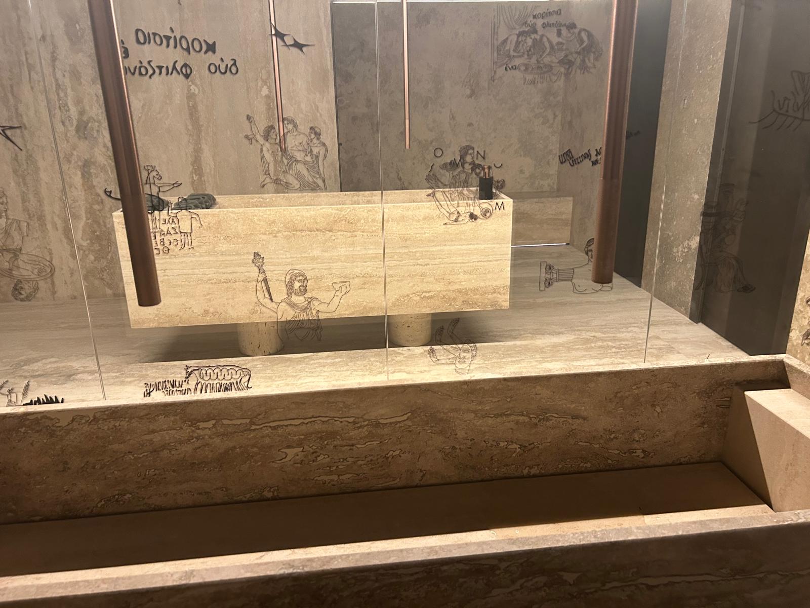Neanche la toilette sfugge all’attenta narrazione che parte dai luoghi e finisce a tavola. Gli arredi si caratterizzano per installazioni a tema fallico, antenate dello scaramantico corno napoletano, e riportano all’ambiente lascivo della popina.