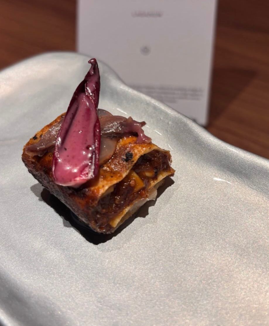 Il laganum romano trasformò la sfoglia di farina e acqua in un piatto più strutturato. I romani lo servivano a strati con carne, pesce e verdure. In altre parole, l’antesignana della nostra lasagna che lo chef interpreta con ragù di orecchia di maiale e anguilla affumicata.