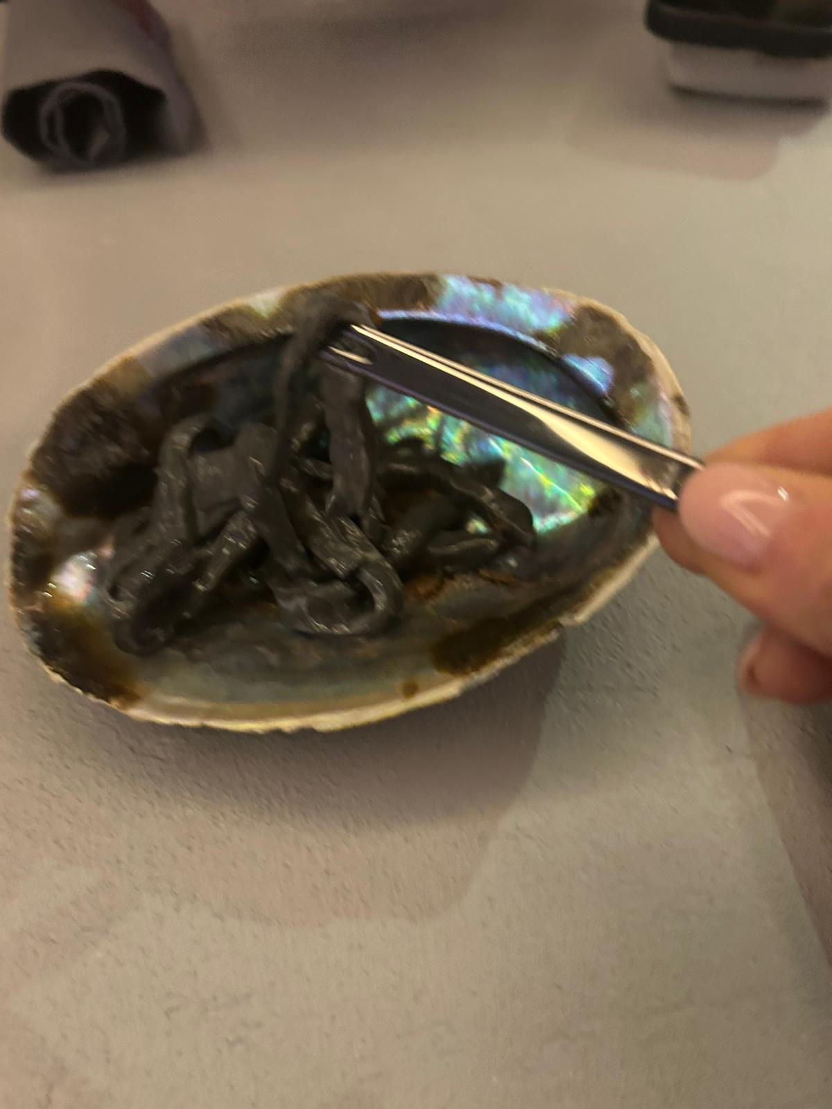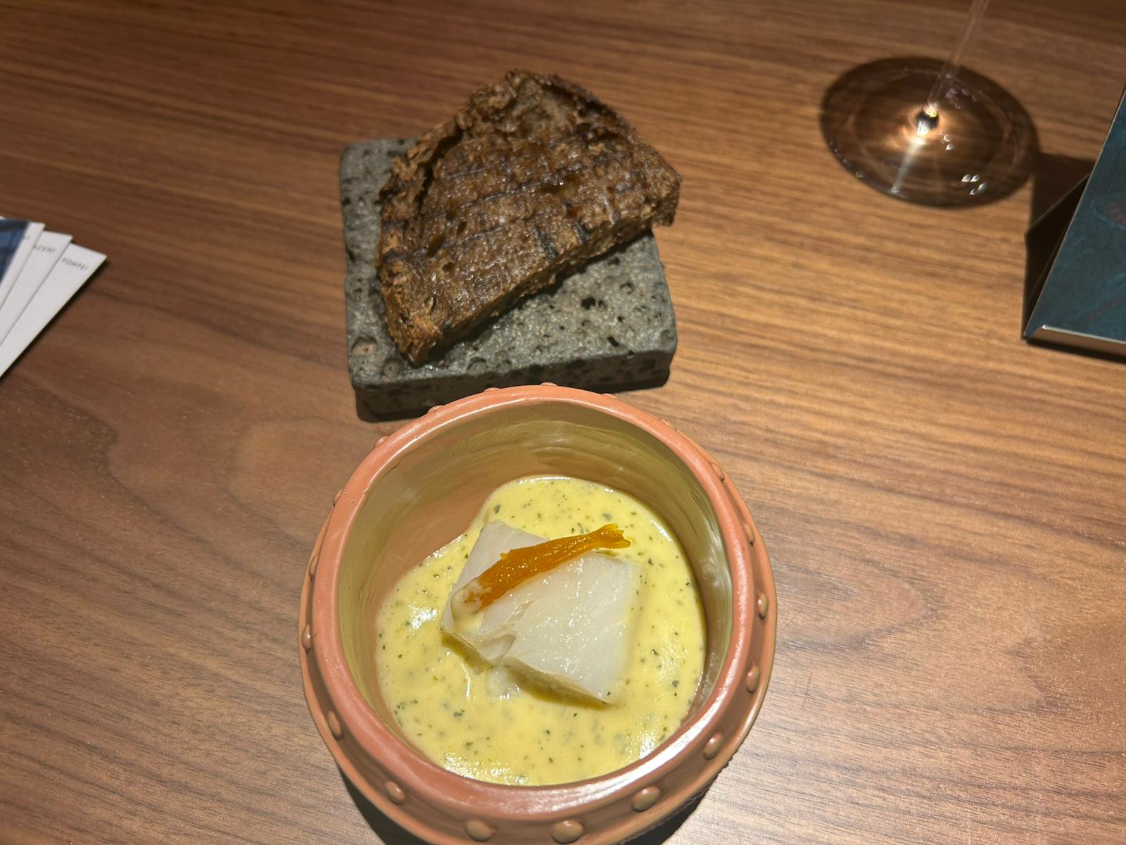 Le Tagliatelle di amido con salsa di fegato di seppia preparano il palato all’ esplosione di iodio del brodo freddo con cervello di crostacei.