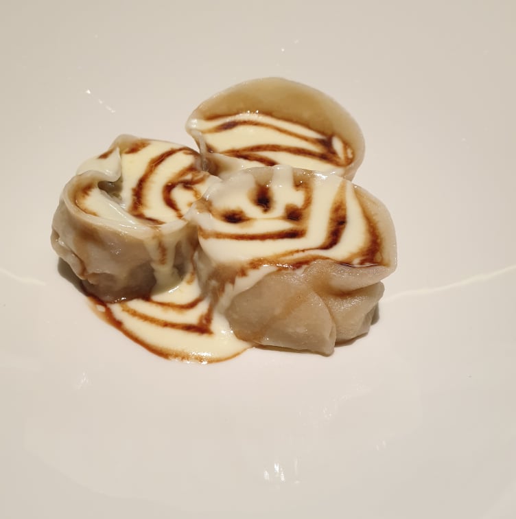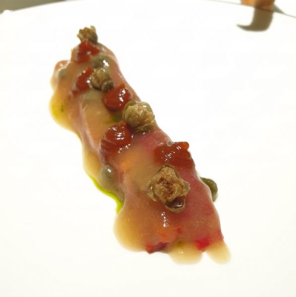 Raviolo alla genovese di tonno con salsa al ragusano e dressing acido di lamponi e soia.