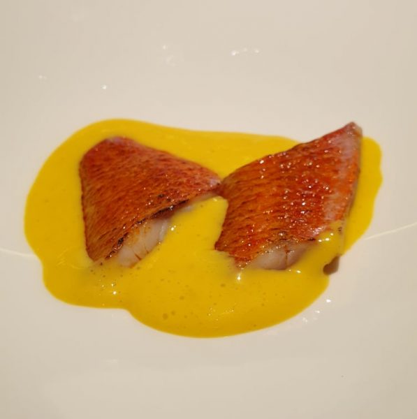 Triglia e fondo di triglia, marinata e cotta a 45 gradi con fondo di lische emulsionate con uova e fegatini di pollo