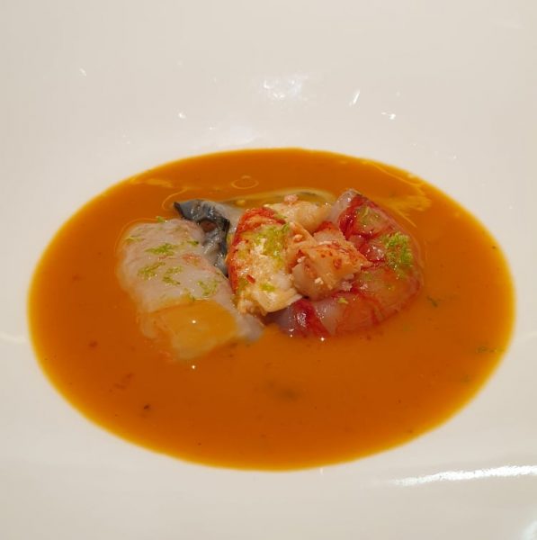 Zuppa di pesce, gli elementi sono crudi nel piatto terminati da una bisque tiepida direttamente al tavolo.