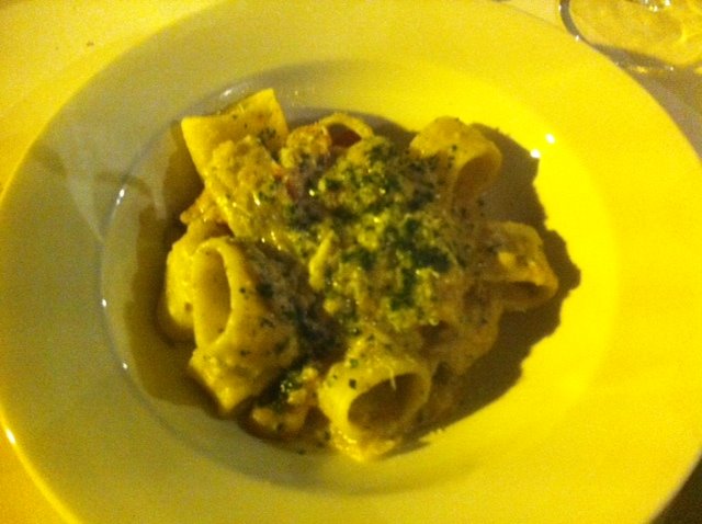 I primi: spaghetti alla chitarra con vongole, gamberetti e pomodorini rossi e gialli, delicato e fresco e calamarata fave pecorino e alici, forte, pieno, come piace a me.