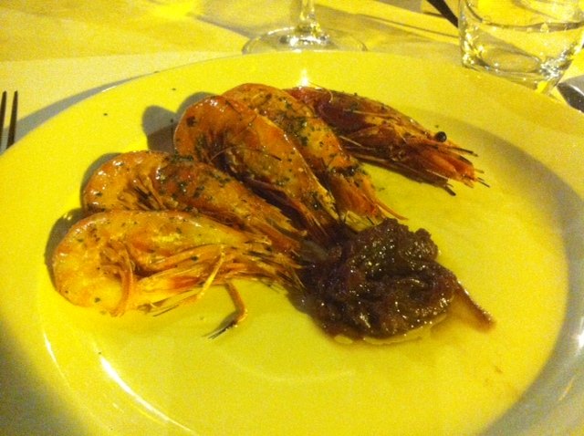 I secondi: frittura di alici e totani, fragrante, leggera, perfetta e gamberoni rossi alla griglia con cipolle caramellate, semplice bontà e freschezza assoluta.