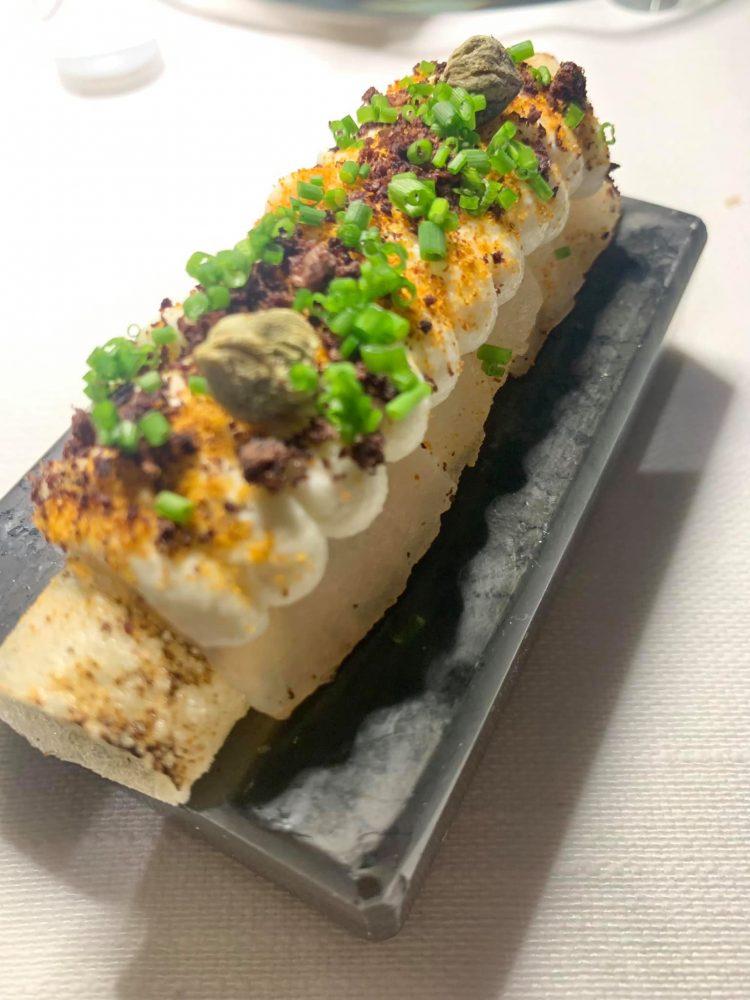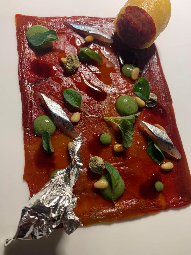 Taverna Estia Spaghettini mantecati in acqua di papaccelle arrosto, gocce di colatura di arici e caviale di aringa