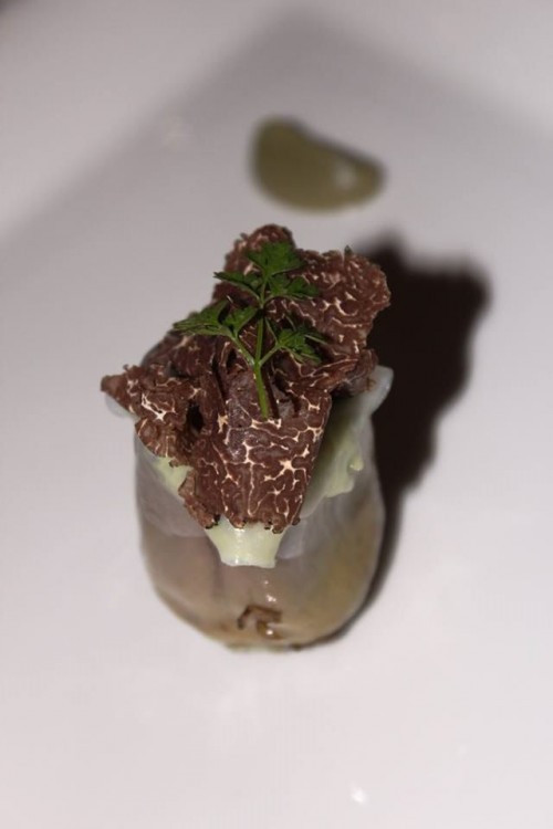 Il Carciofo cotto in olio extravergine, affumicato e farcito con spuma al pecorino, guanciale e tartufo nero, è il riassunto della cucina di Francesco. Nessuna voglia di stupire, grande maturità e concentrazione massima sul sapore.
