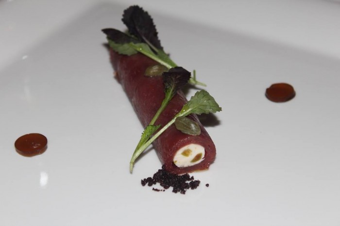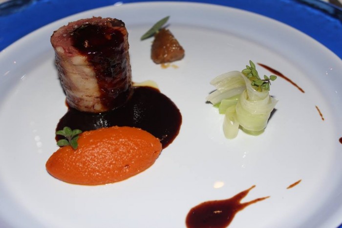 Arriva il piatto del viaggio, la torcinella di capriolo selvaggio, crema di zucca, composta di uva ed indivia. Veramente delizioso con una cottura della carne molto coraggiosa, e con la lonzina di maiale a fornire un accenno di grasso, applausi.