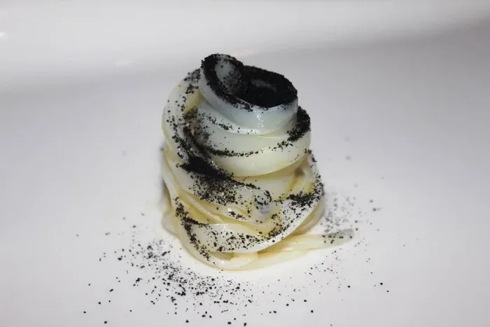 Taverna Estia, tagliatelle di calamaro verace con il suo nero 24/2/2016 Torna a: Taverna Estia: Francesco Sposito tecnica francese e cuore napoletano Taverna Estia, tagliatelle di calamaro verace con il suo neroSuccessiva →