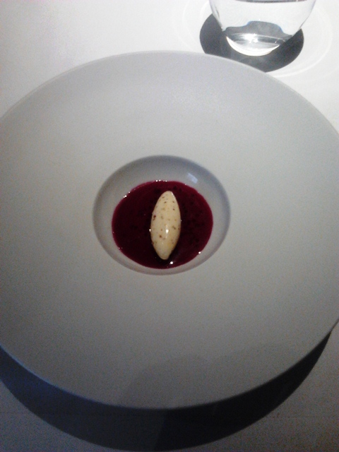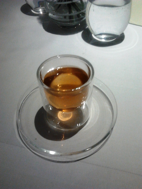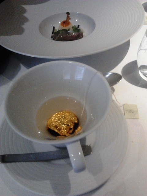 Vi piacciono le favole? A Blummenthal si, a me di più! Una tazza con dell’acqua calda, un piatto senza brodo con dentro un uovo di tartaruga finto, preparato con una mousse e pezzetti di testa di vitello arriva una scatola con degli orologi d’oro (un brodo concentrato ricoperto da una sottile sfoglia d’oro) come nella favola di Alice nel paese della meraviglie il cappellaio matto mette l’orologio nel thè per accomodarlo e noi facciamo lo stesso. Il brodo si scioglie e poi versiamo il brodo nel piatto. Et voilà favola di Alice e zuppa di finta tartaruga diventano il nostro piatto… mi sento come se avessi provato l’acqua della luna.