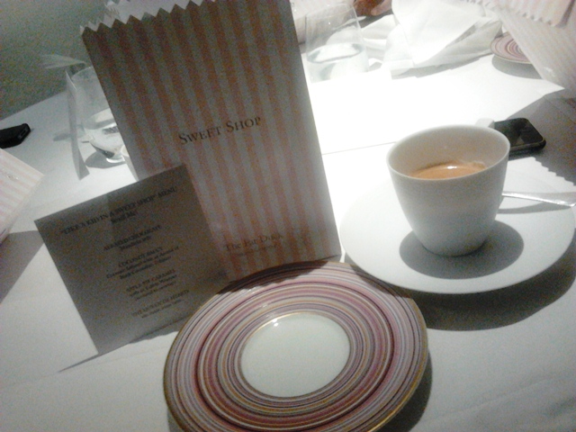 Provando a ragionare senza aver provato, anzi chiedendo permesso, del FD mi hanno sempre colpito le luci e i colori. Luci di taglio, sempre bianche e colri pastello, molto inglesi, per non dire di atmosfera, quasi da illustrazioni country and cottage. C’è un che da stanza delle bambole, le righe alle pareti, le tazze, tante tazze. Credo che l’anno che viene citato accanto al nome del piatto sia un riferimento preciso a ricette della tradizione, anche precedenti il periodo vittoriano, anche se in effetti Lewis Carroll e la regina Vittoria sembrano imperversare e ammantare la tavola. Insomma nei piatti sembra esserci più un riferimento estetico e letterario, piuttosto che culturale e mnemonico: sembra questa la differenza con la tendenza della nostra migliore cucina contemporanea. I gadget elettronici forse sono superflui, a meno che non si voglia sottolinerae l’aspetto fisico, tattile rispetto al gusto. Al pari del Noma, proprio per questa “estraneità” alla nostra cultura credo sia un’esperienza molto affascinante. Credo solo, purtroppo.