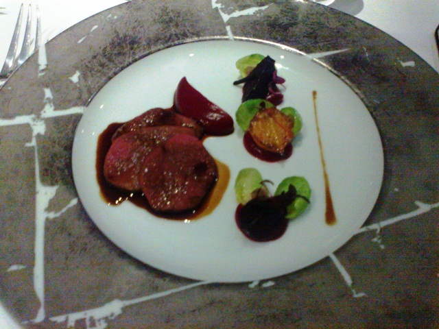 Sella di cervo cotto a bassa temperature (circa 2 ore e 30) con soubise di barbabietola, risotto di farro con animelle e tartufo nero. Divorato, non mangiato….. divorato