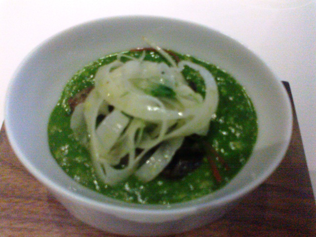 Pane di due tipologie bianco e integrale con lievito madre ed un burro non pastorizzato e leggermente salato, Zuppa d’avena e prezzemolo, nastri di finocchio, lumache e listarelle di Jambon iberico, due persone possono fare questa richiesta io e Maffi, io la faccio: Se ne potrebbe avere ancora 2 – 3 porzioni, lo finisco… lo finisco…