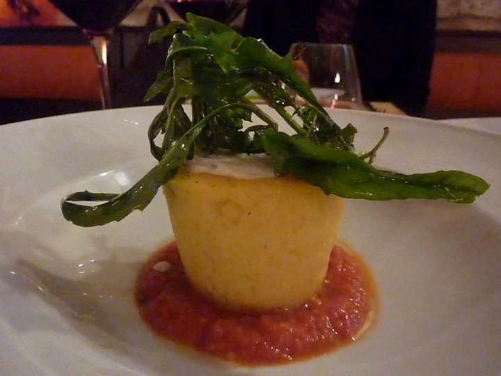 Segue l’antipasto: il Cestino di polenta con caciocavallo Podolico, funghi e salsicce la cui presentazione, con un ciuffo di rucola croccante, è piacevolissima ma che non trova il bilanciamento alla grassezza del formaggio e alla pastosità della polenta @@