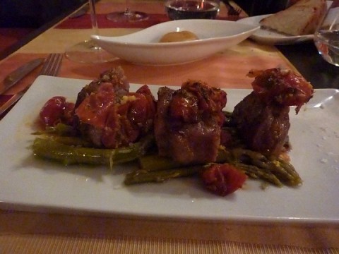 Poi il secondo: il Controfiletto cotto a bassa temperatura alla arancia staccia di Tursi su letto di pomodori secchi e carciofi di Caggiano (sostituiti, questi, con gli asparagi) che propone un piacevolissimo gioco di profumi e acidità con l’arancia, sebbene non eccella nella tenerezza della carne