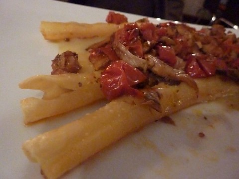 Il primo: Zattera di cannazze con ragù di pomodoro al forno e cardoncelli su crema di patate affumicate che è un piatto dell’infanzia dello chef: ziti spezzati lunghi e disposti a mo’ di zattera, in passato fatto con il ragù di maiale. Saporoso e un po’ antico, forse un po’ troppo asciutto a chi è abituato a quello di stile napoletano.
