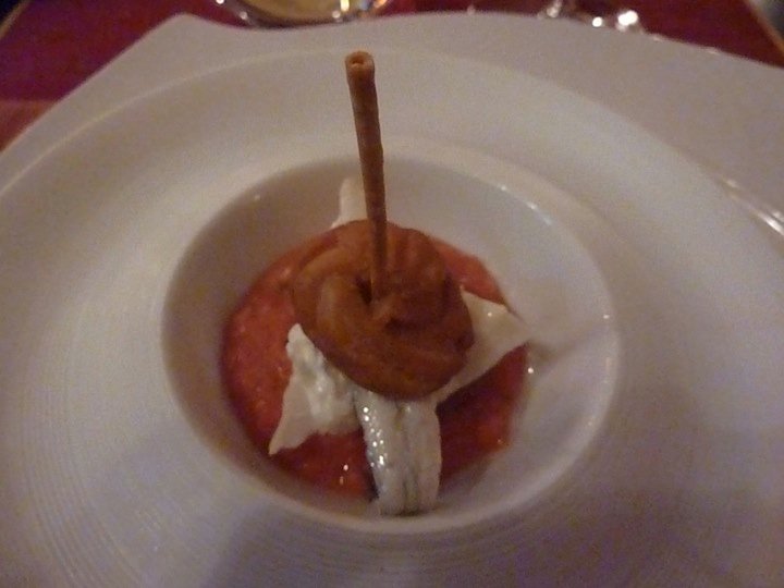 Sfila così la Entrèe proposta dalla casa: Zeppolina su burrata di Andria, alice marinata e salsa di pomodoro, un piatto intenso e fresco che alla croccantezza della zeppola alterna la succulenza dei altri elementi ma che fa del pomodoro fresco lavorato con della cipolla come se fosse un gaspacho il suo magnifico slancio. Chi ben comincia!