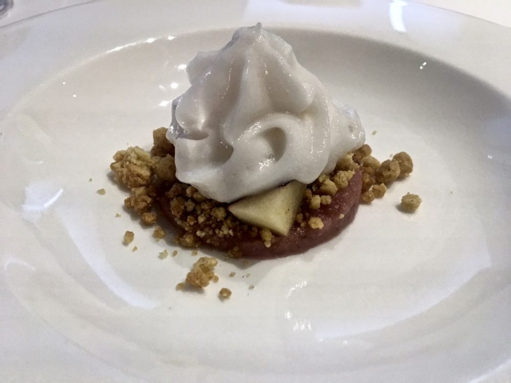 Siamo quindi al dolce che, solitamente, oltre i sorbetti è assolutamente un evento unico: una composta di mele con mele a cubetti, crumble all’olio e cannella e una spuma alla vaniglia. Aliberti è pasticcere di formazione e riversa le sue conoscenze in questa piccola delizia poco dolce e a base vegetale, in linea con i canoni della moderna pasticceria.