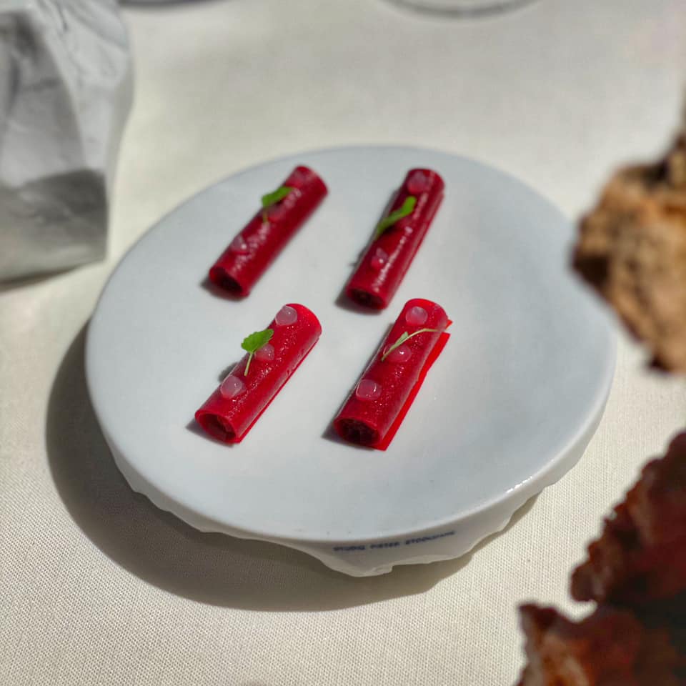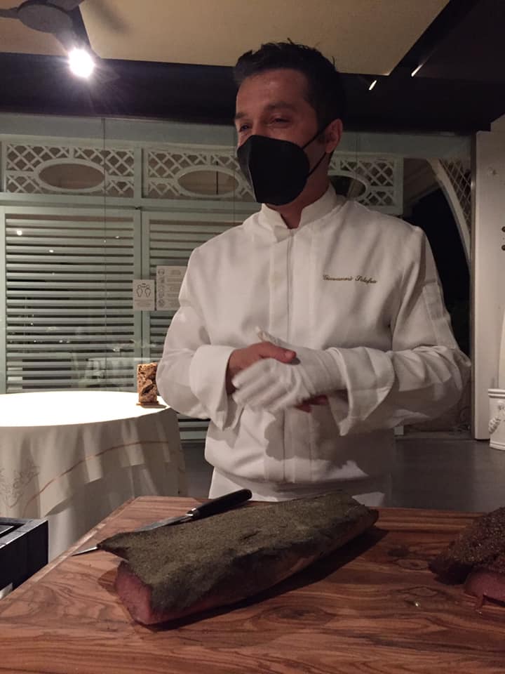 Giovanni Solofra è qui con la sua compagna di vita e di lavoro, l’abruzzese di Avezzano Roberta Merolli a cui è affidato tutto il comparto dei lievitati. Un sodalizio nato proprio all’ombra del panzer tedesco alla Pergola di Roma e che trova adesso qui un nuova possibilità. Dal maestro Solofra ha acquisito la professionalità, la disciplina di cucina, la pulizia, l’affidabilità. Dall’essere campano che si esibisce per la prima volta nella propria regione l’intuito verso il buono e la conoscenza di prodotti e di biodiversità, dalla esperienza siciliana la visione di un Mediterraneo ancora più ricco di profumi e di spezie.
