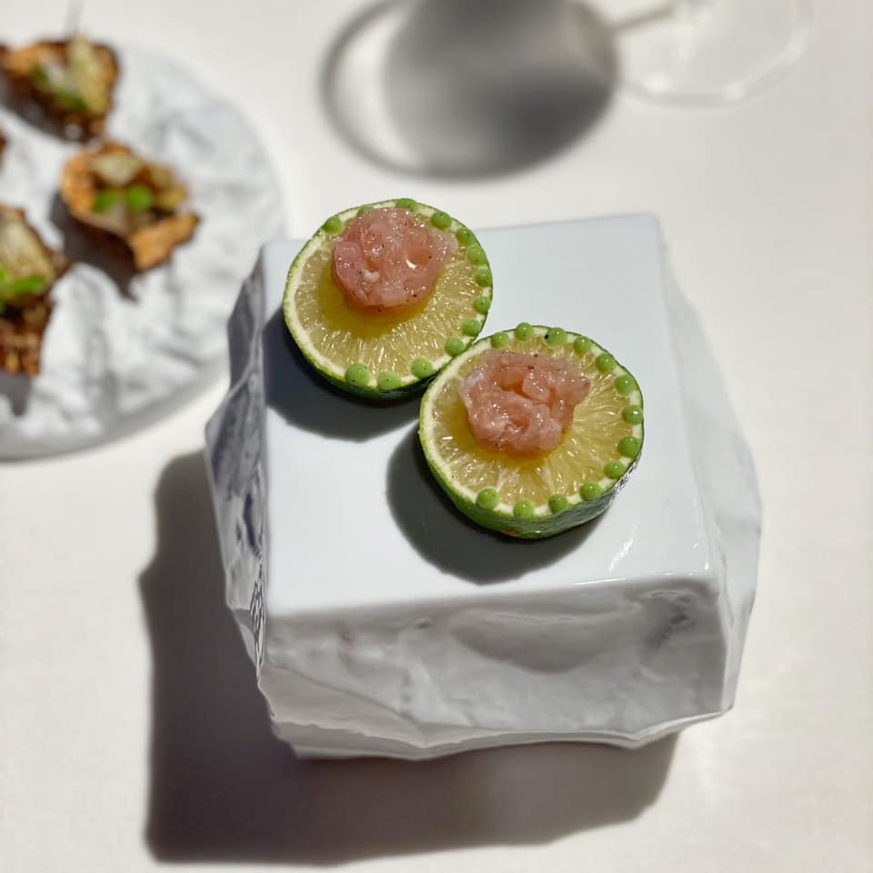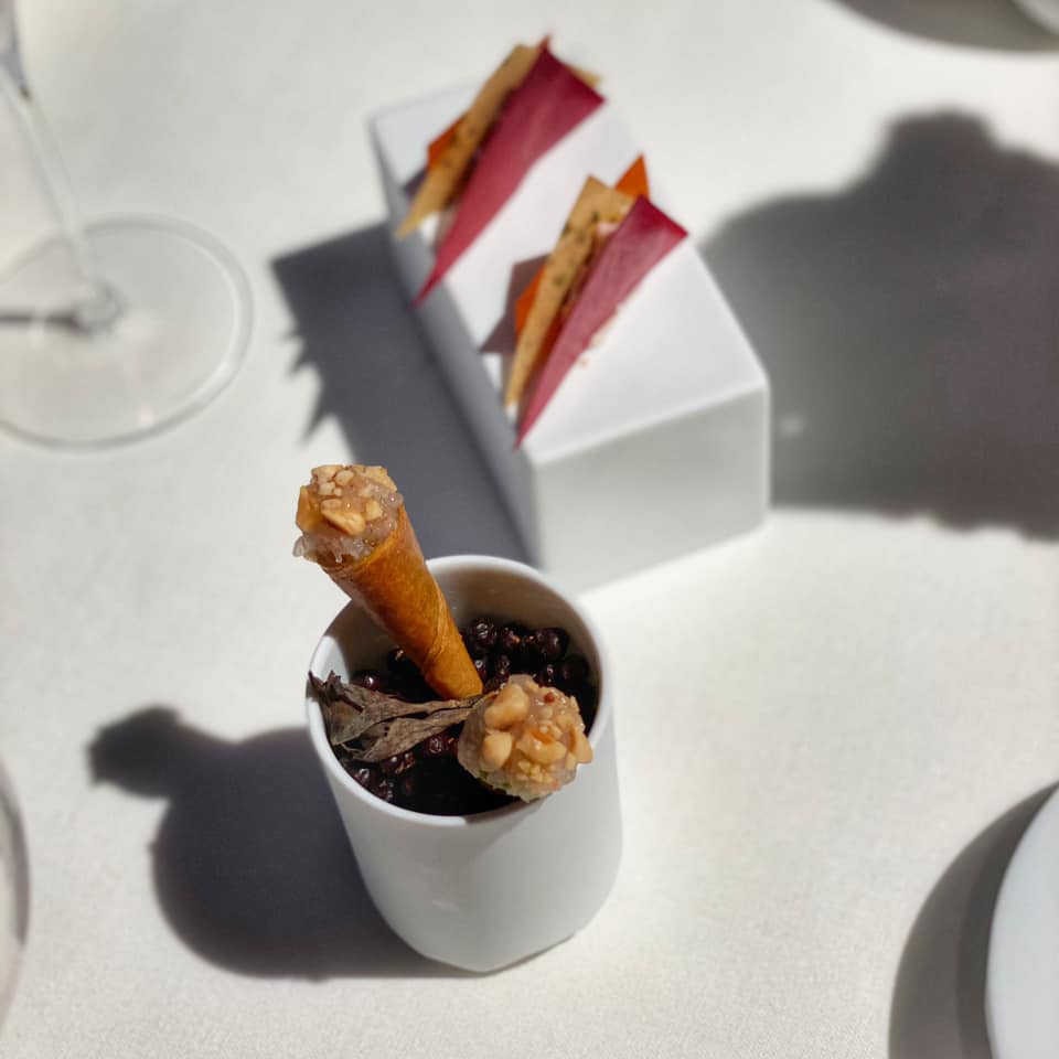 Non a caso definisce la sua una cucina mediterranea, uno stile che sta crescendo in maniera esponenziale in tutto il mondo per la capacità di non escludere niente e di mettere vegetali e mare in primo piano. Già il suo aperitivo è una serie di fuochi di artificio con sapori decisi, mai scontati.